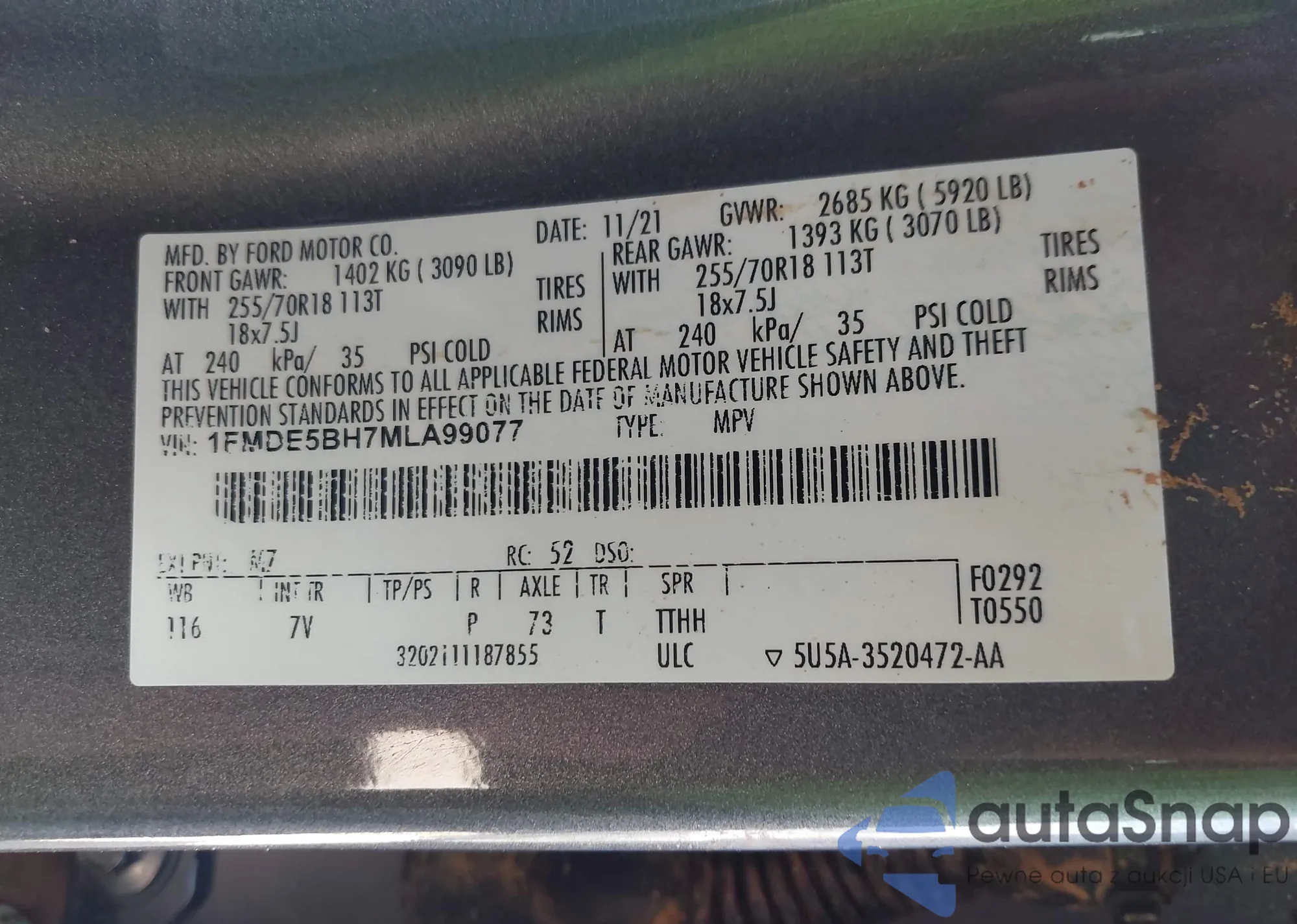 LOT: 42213383 VIN: 1FMDE5BH7MLA99077