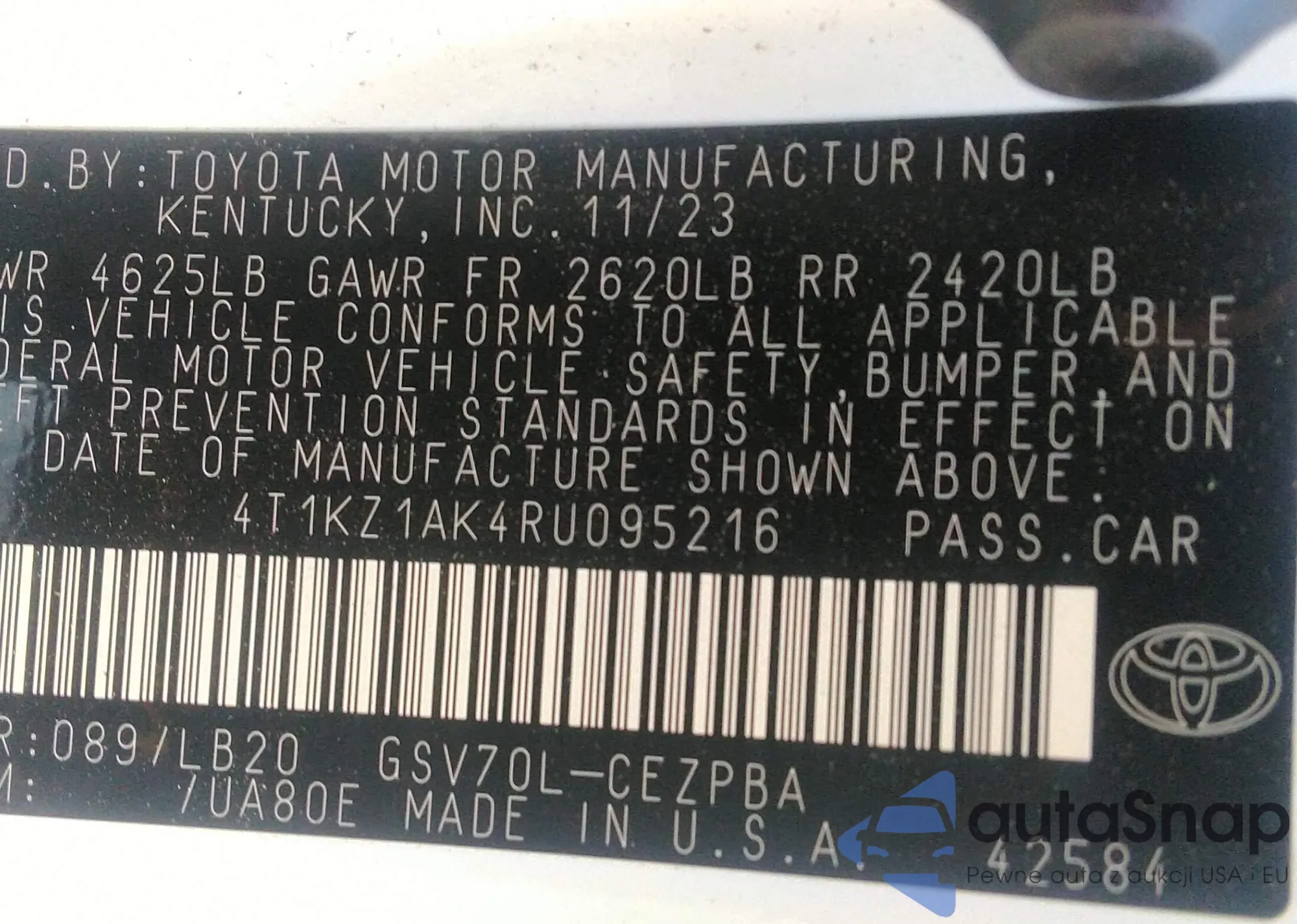 LOT: 42438327 VIN: 4T1KZ1AK4RU095216