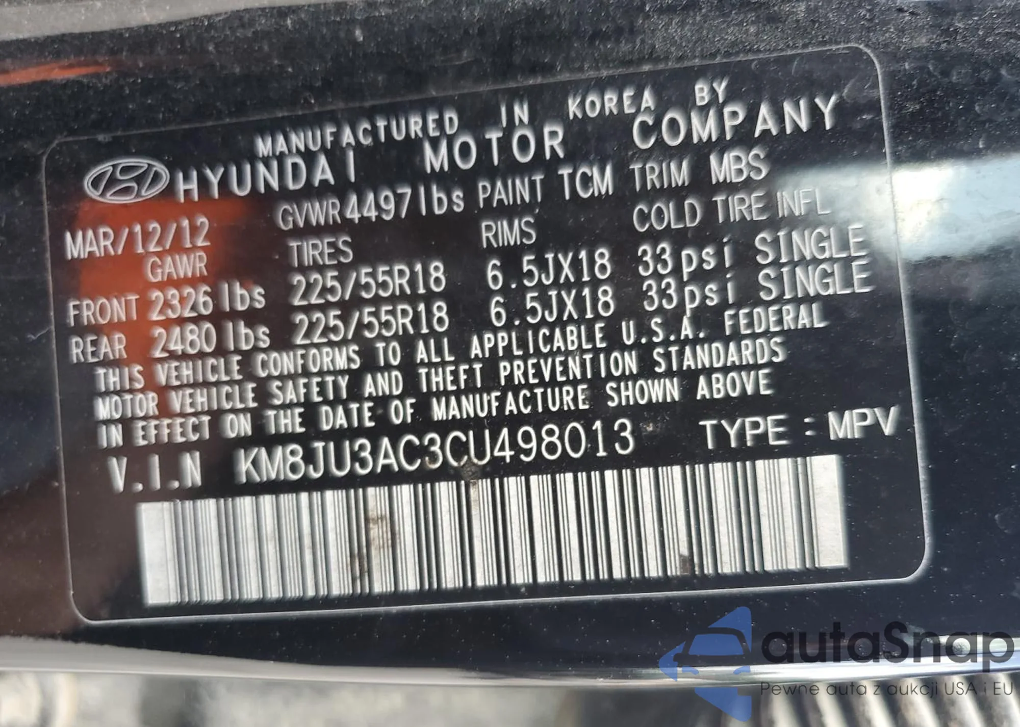 • VIN KM8JU3AC3CU498013