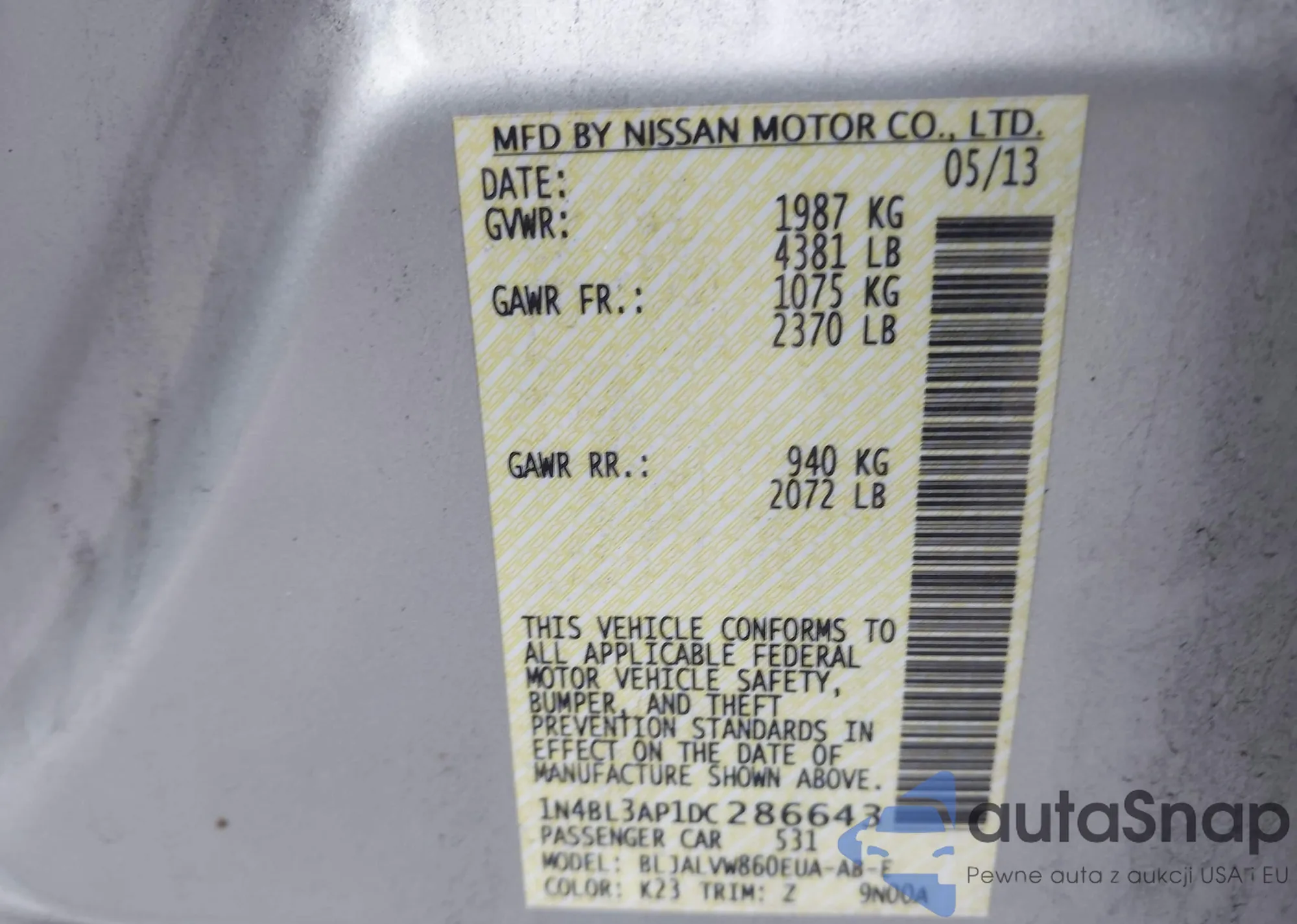 • VIN 1N4BL3AP1DC286643