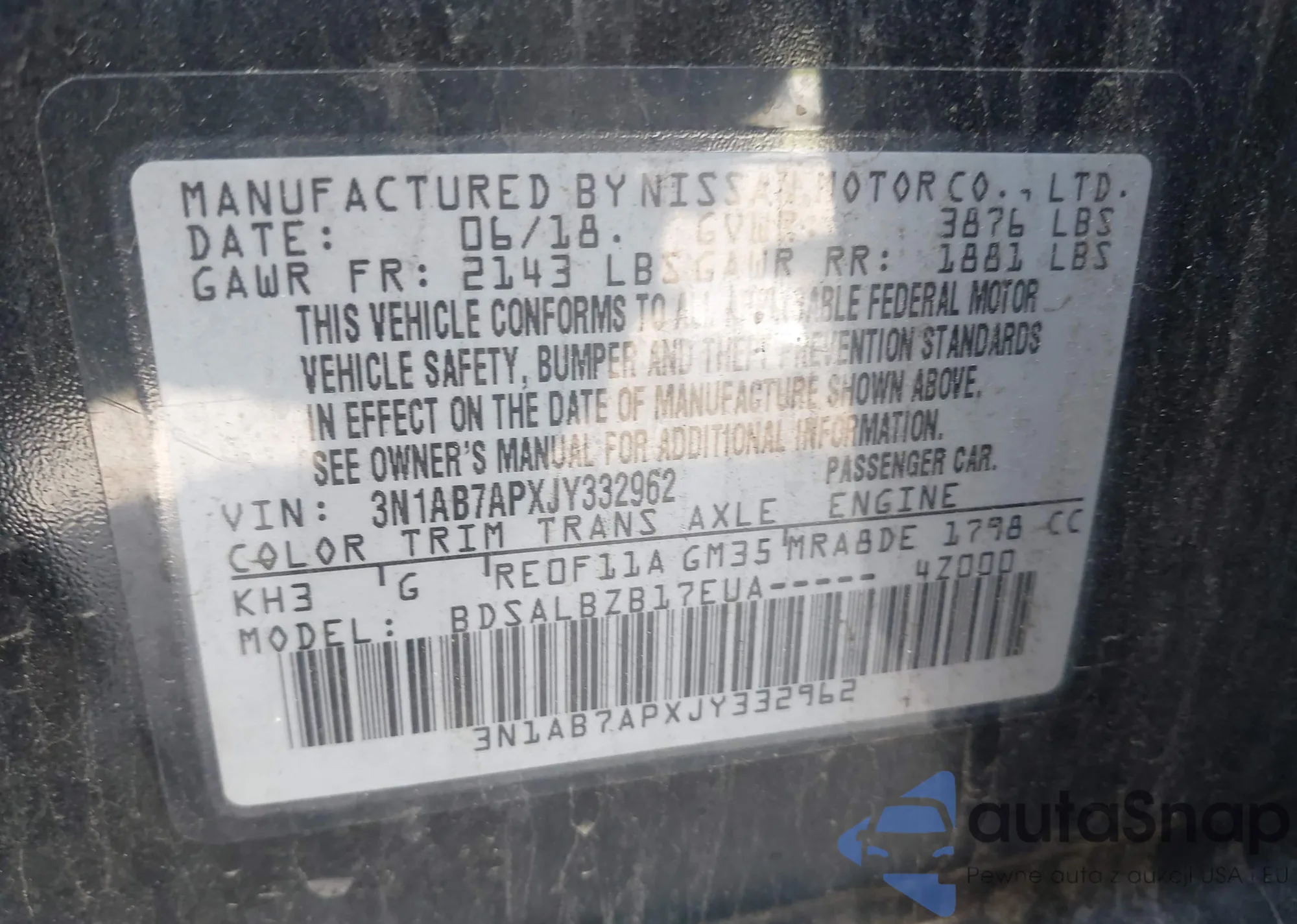 LOT: 42259446 VIN: 3N1AB7APXJY332962