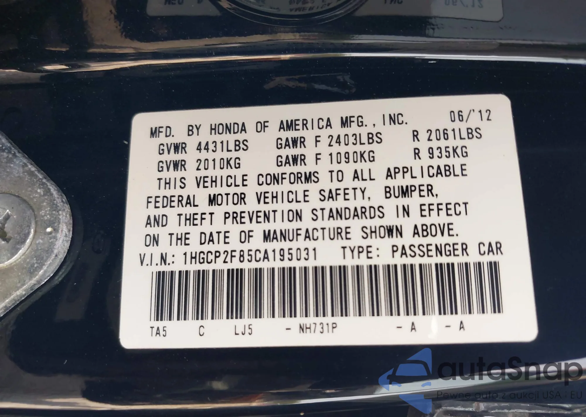 • VIN 19UUA8F53AA010857