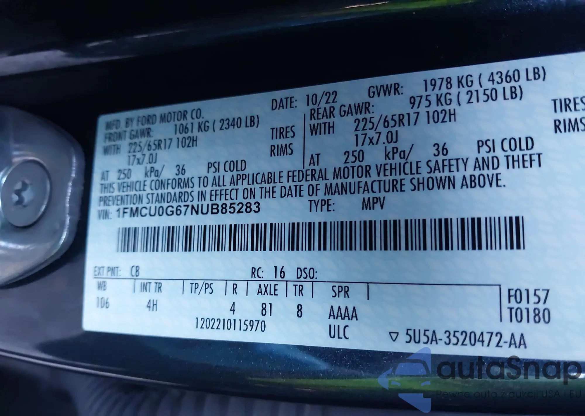 • VIN 1FMCU0G67NUB85283