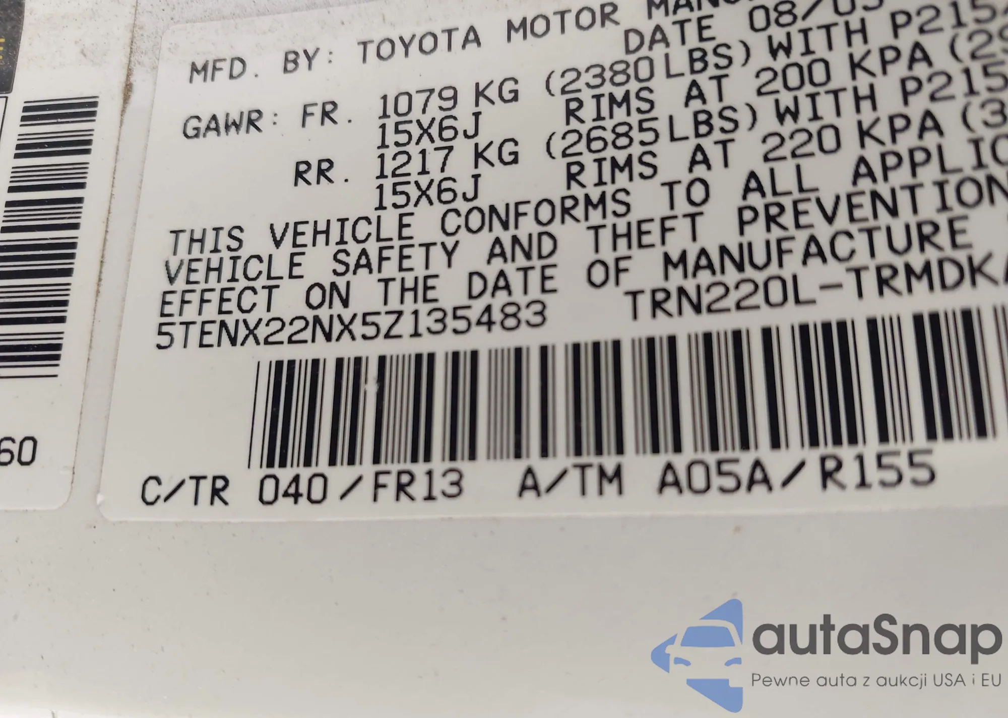 • VIN 5TENX22NX5Z135483