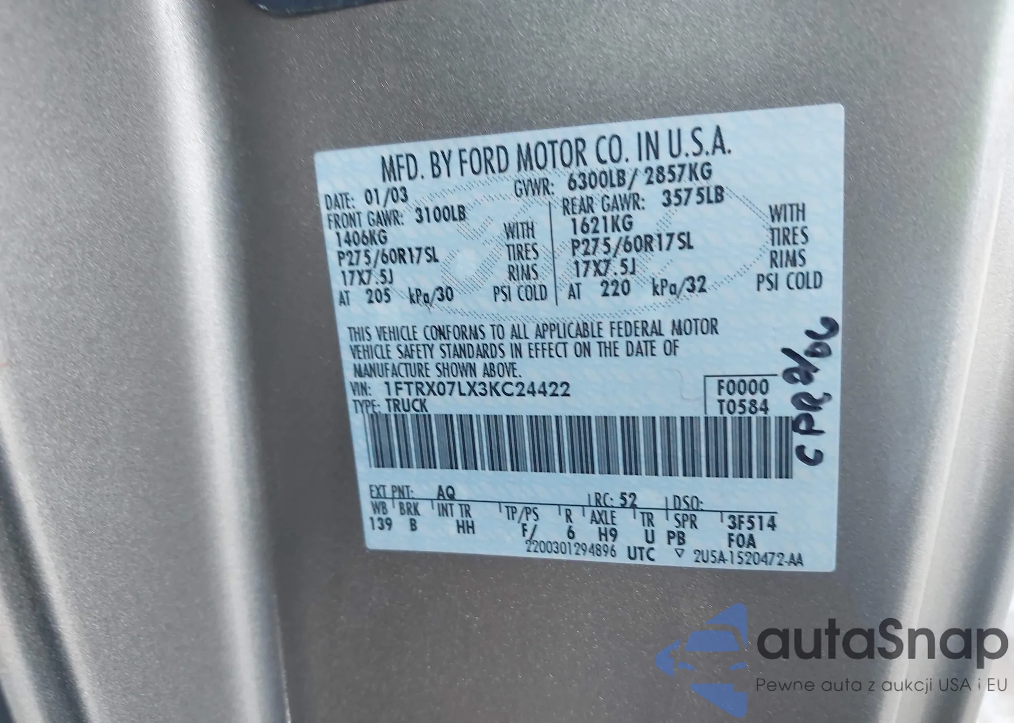 • VIN 1FTRX07LX3KC24422