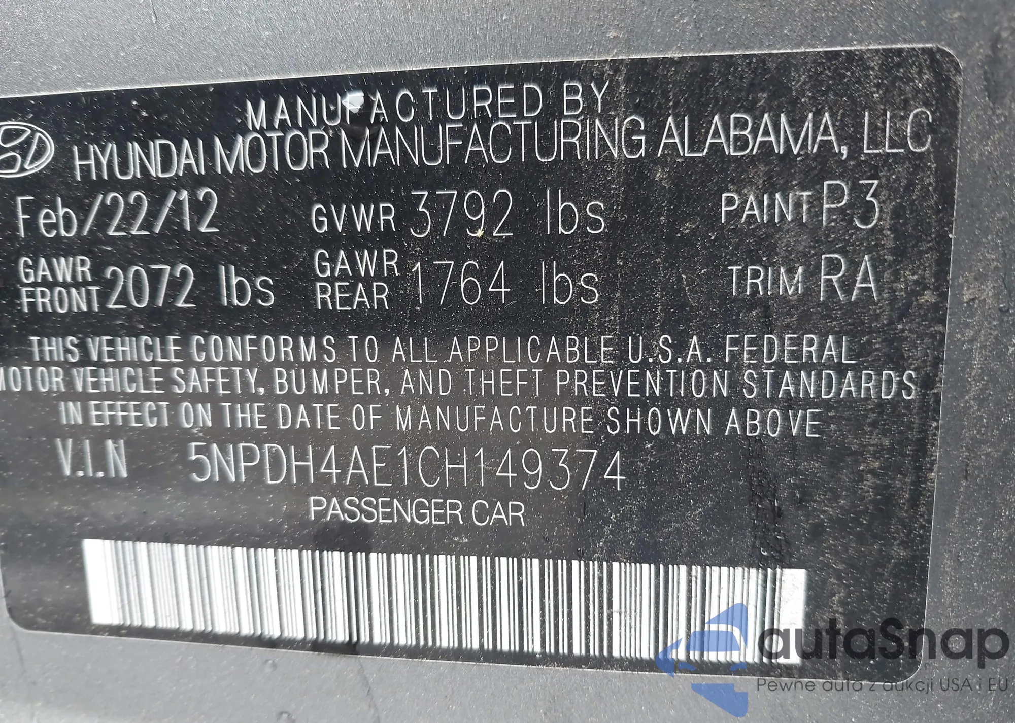 • VIN 5NPDH4AE1CH149374