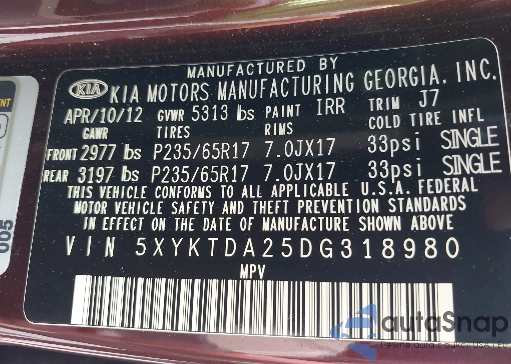 LOT: 42638031 VIN: 5XYKTDA25DG318980