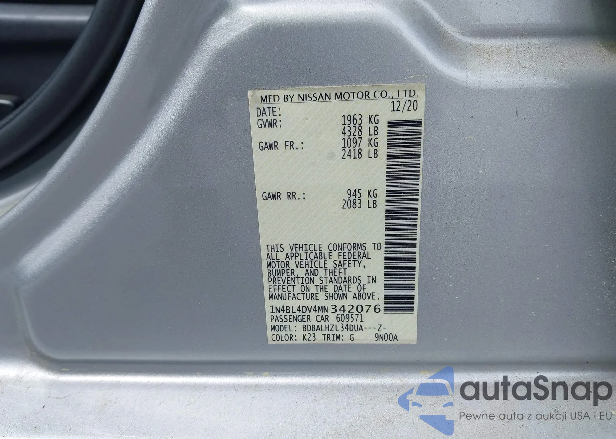 LOT: 42124952 VIN: 1N4BL4DV4MN342076