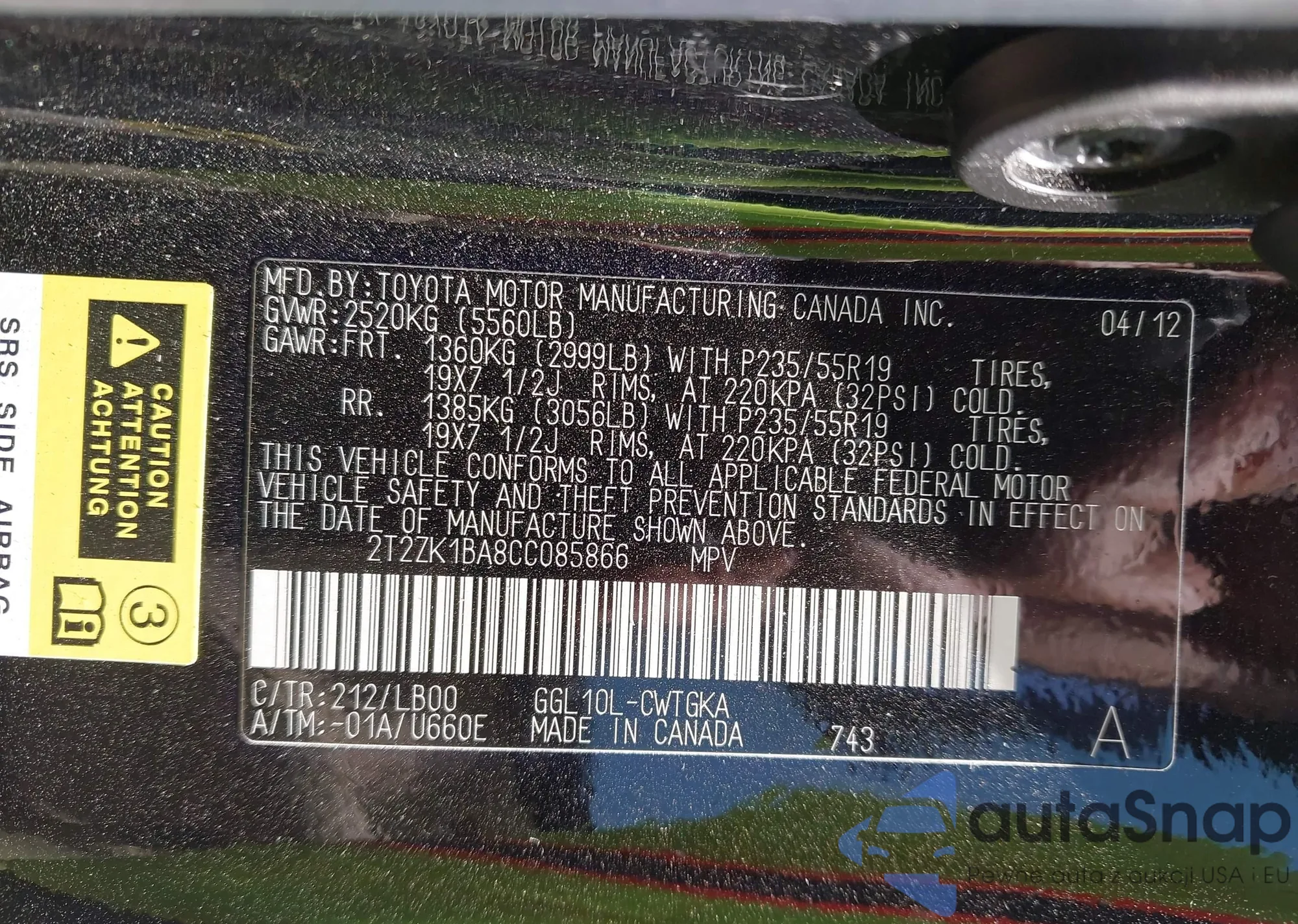 • VIN 2T2ZK1BA8CC085866