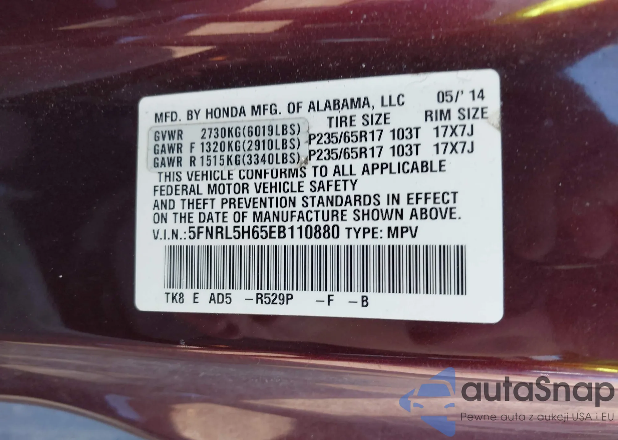 • VIN 5FNRL5H65EB110880