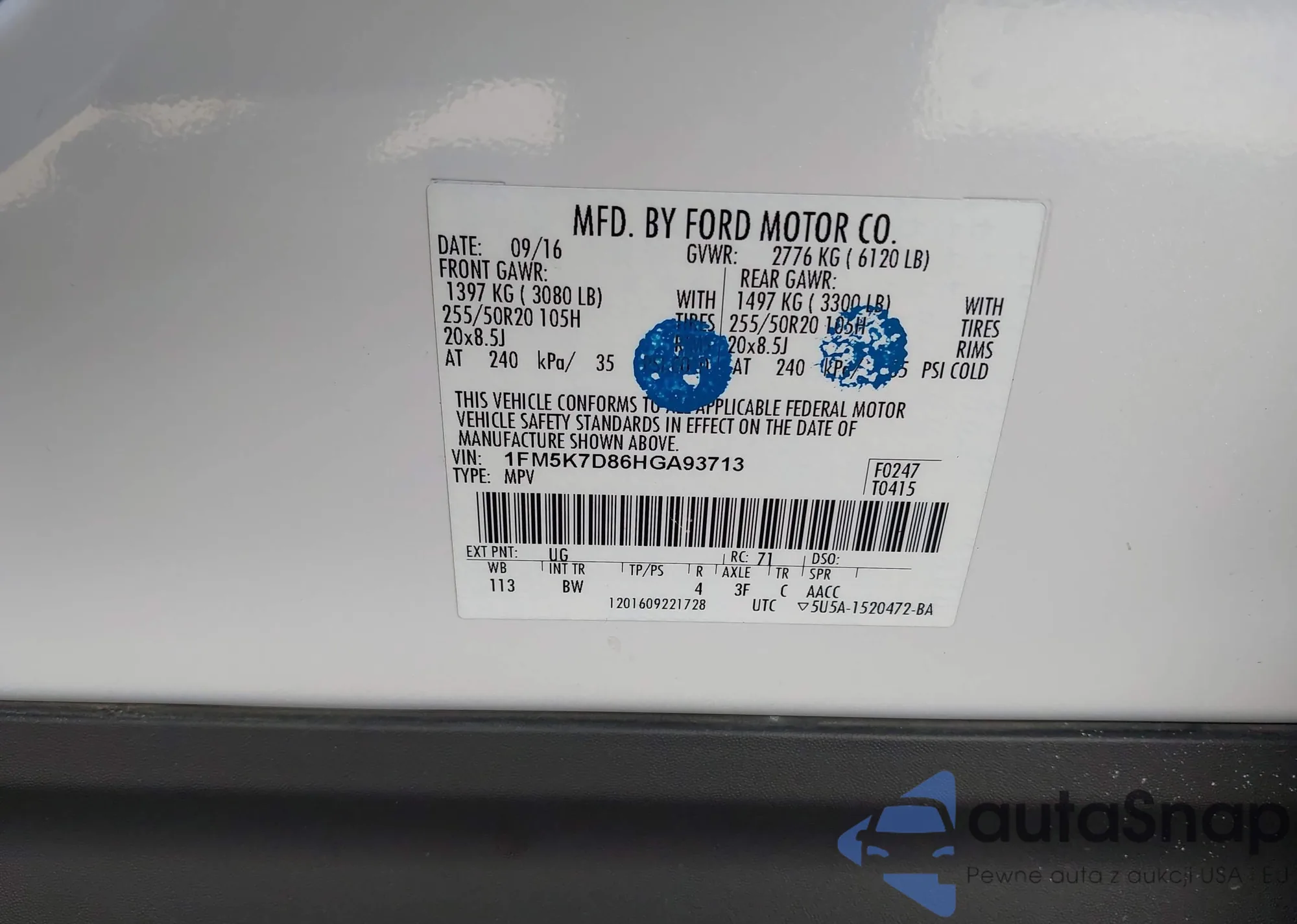LOT: 42742543 VIN: 1FM5K7D86HGA93713