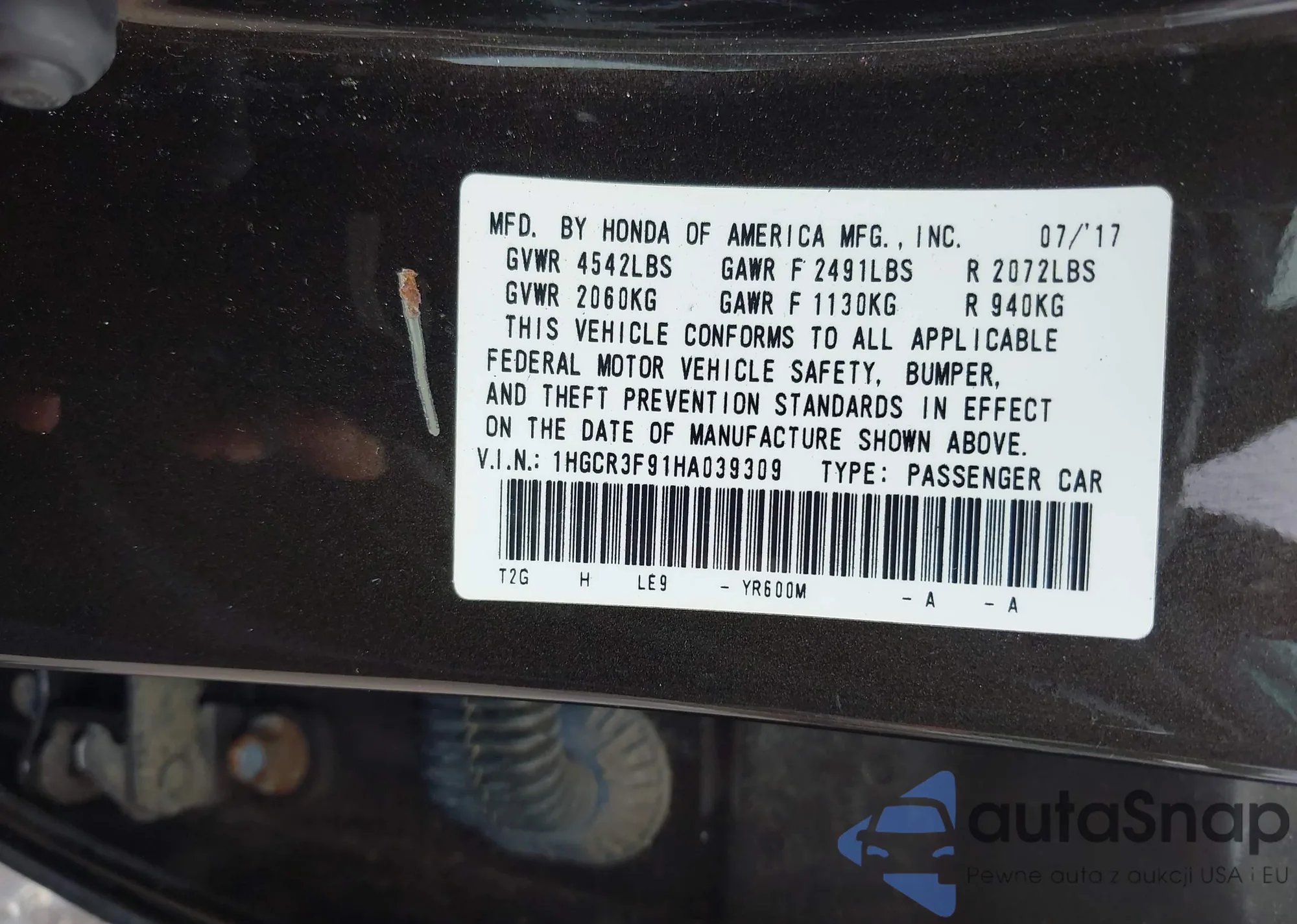 LOT: 42522155 VIN: 1HGCR3F91HA039309