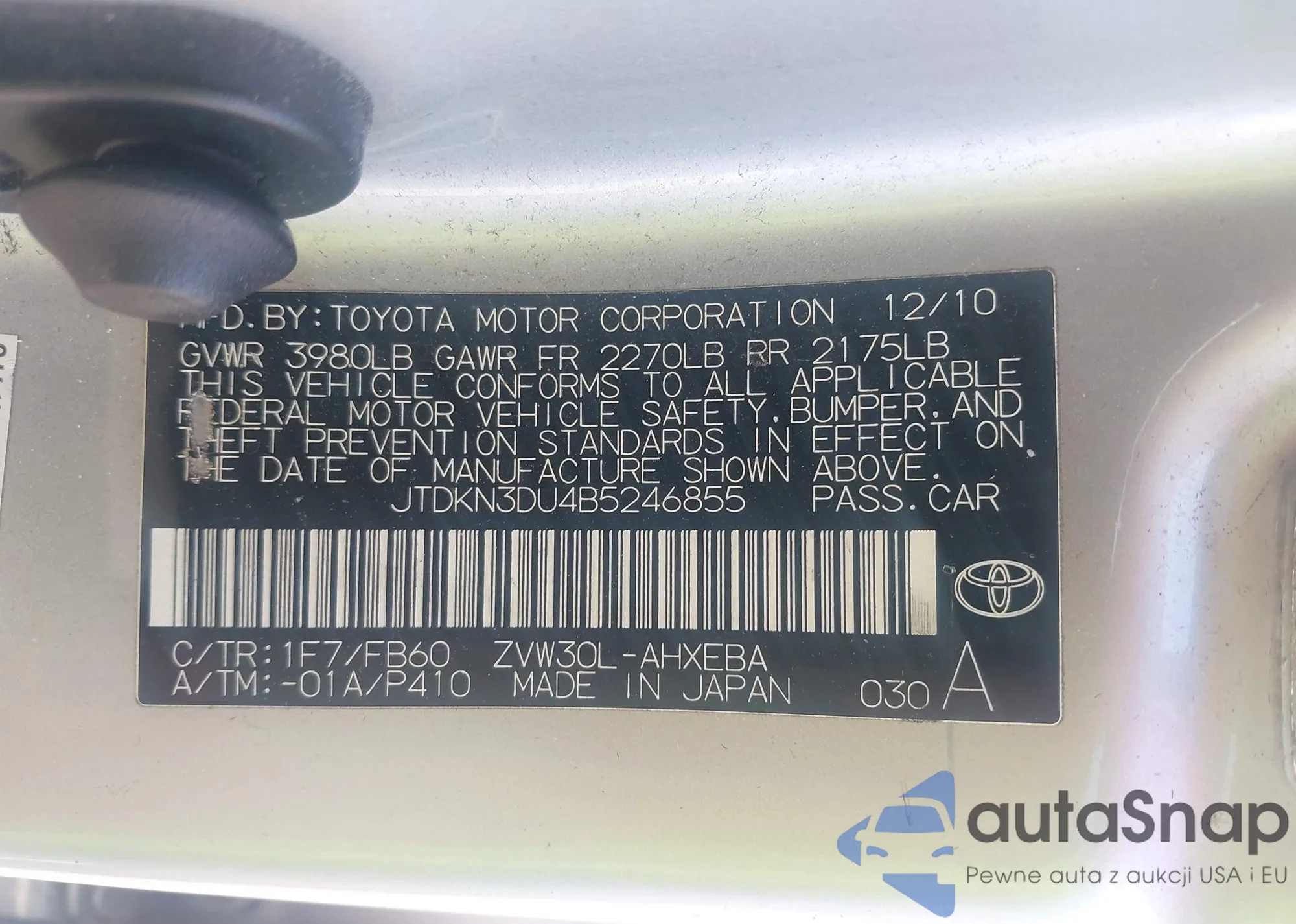 LOT: 42327667 VIN: JTDKN3DU4B5246855
