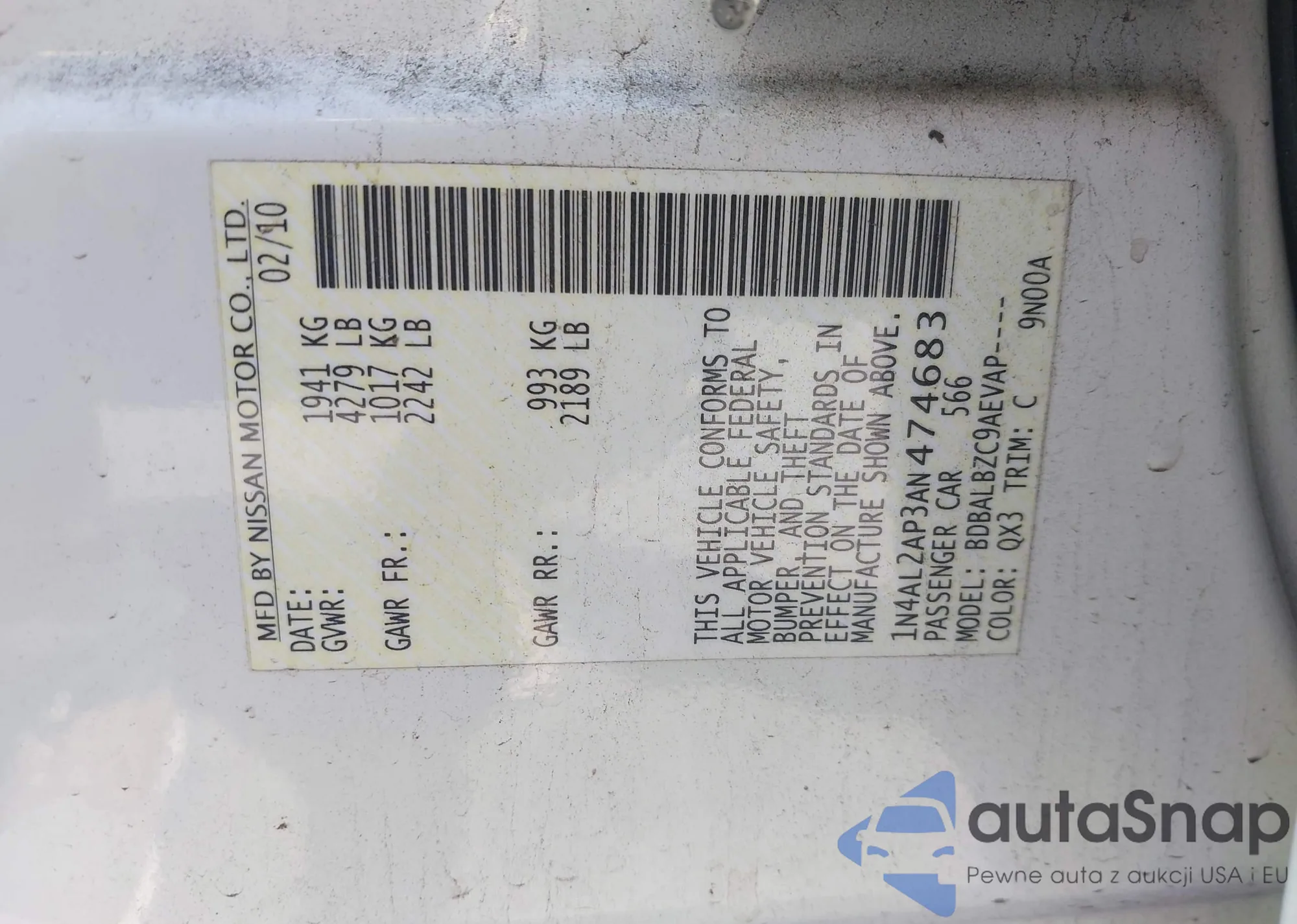 LOT: 42582850 VIN: 1N4AL2AP3AN474683