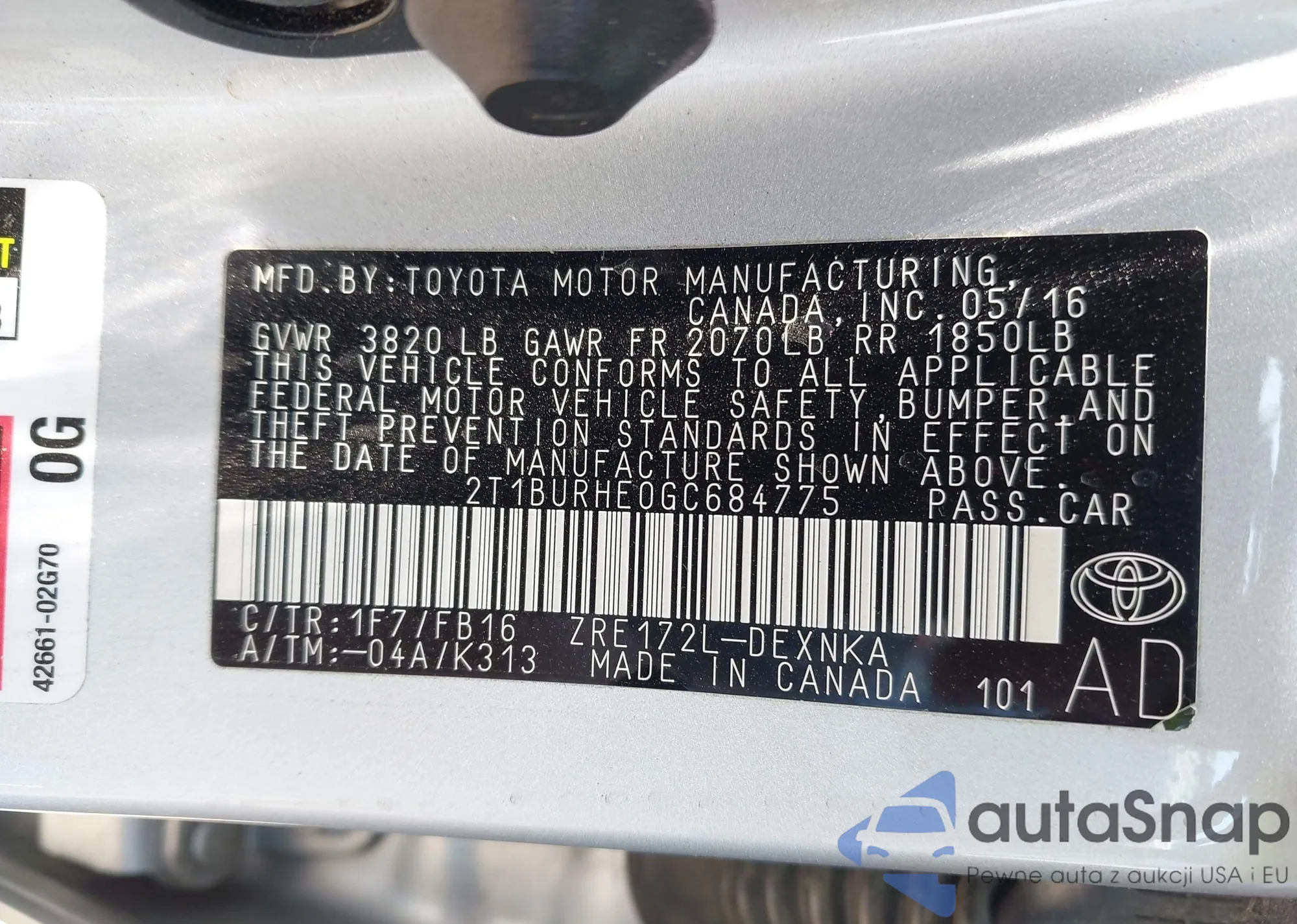 LOT: 42720936 VIN: 2T1BURHE0GC684775