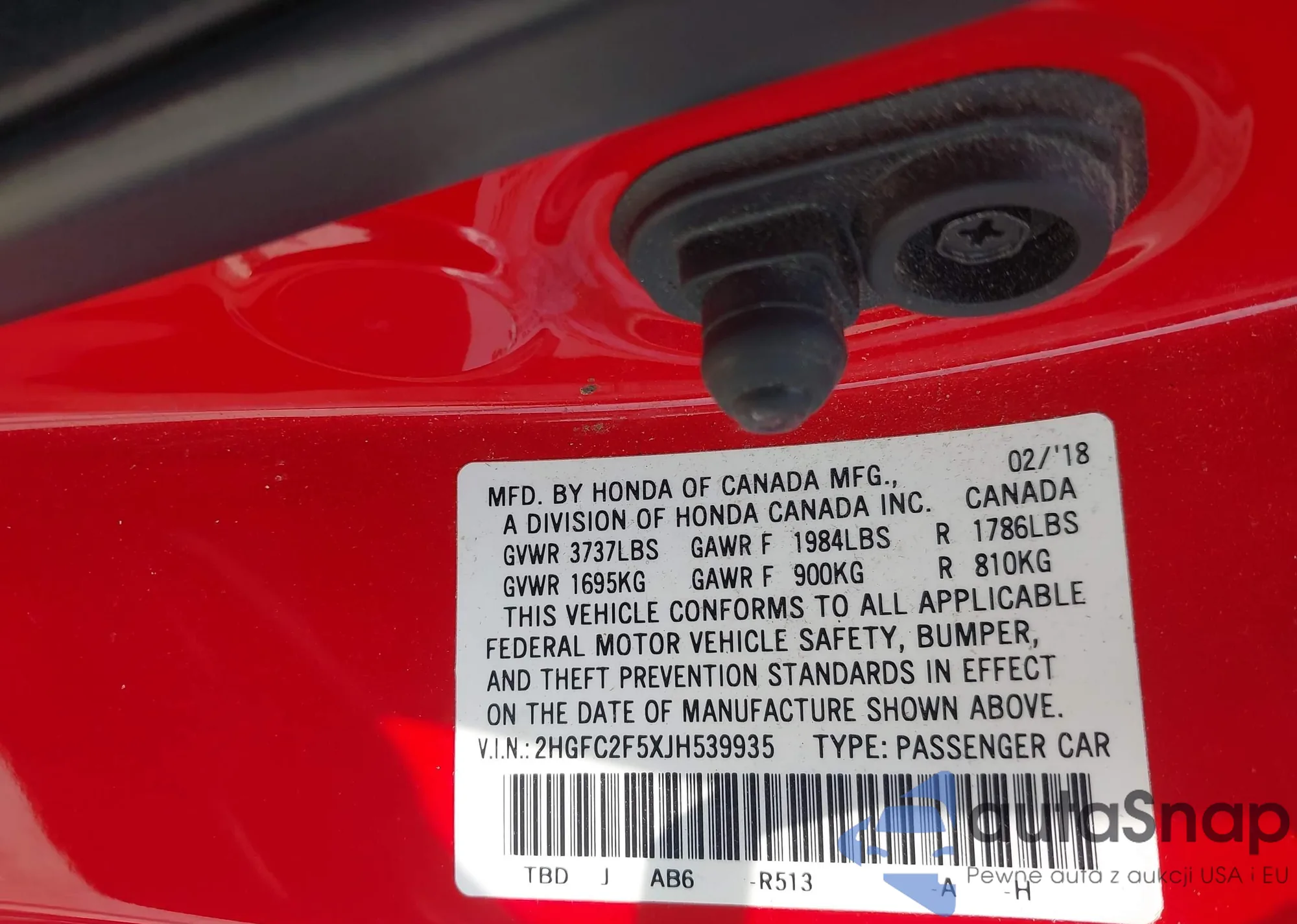 LOT: 42727978 VIN: 2HGFC2F5XJH539935