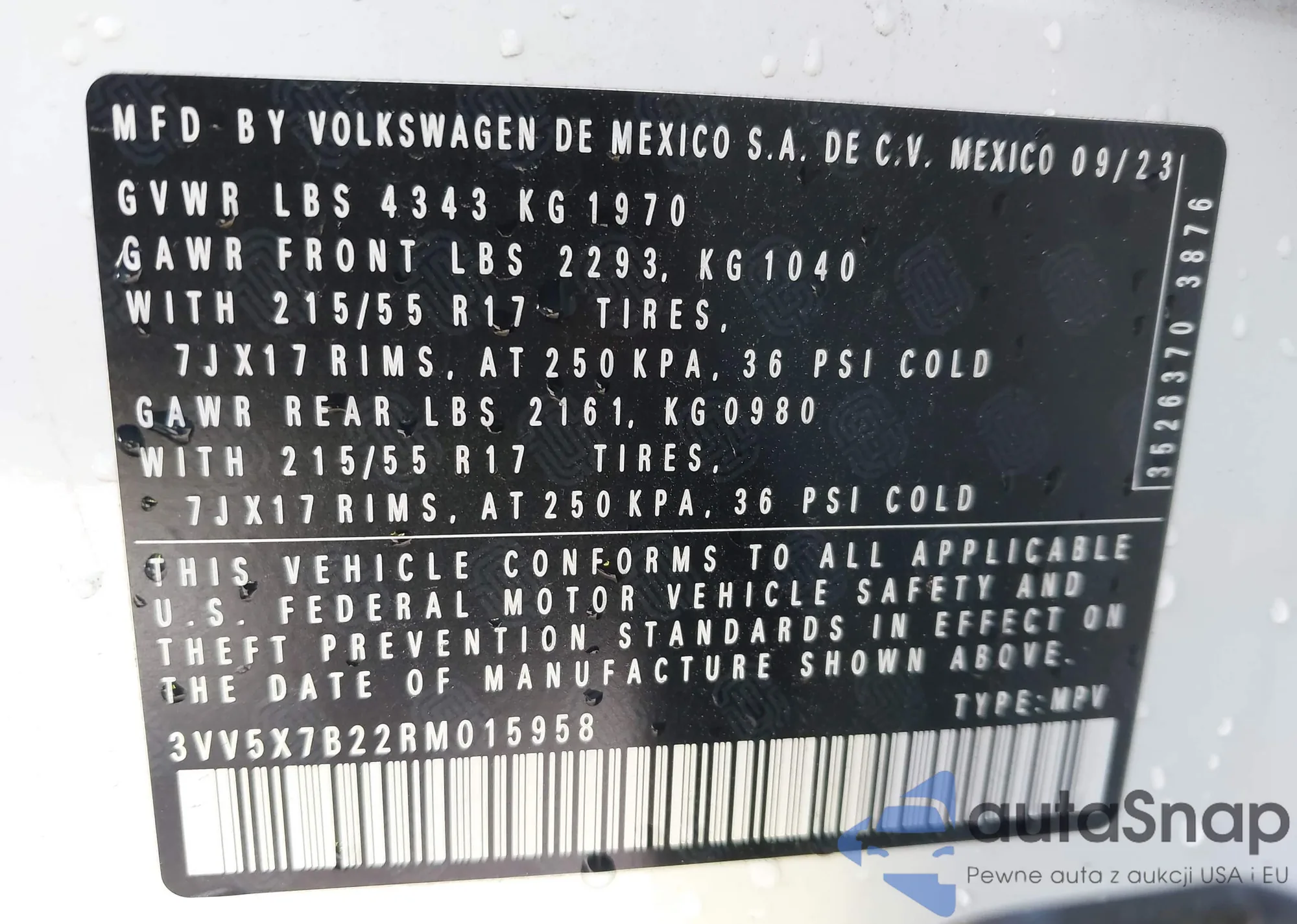 • VIN 3VV5X7B22RM015958