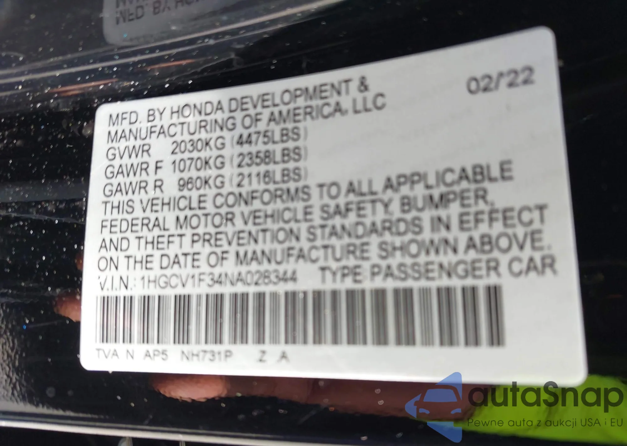 LOT: 42757060 VIN: 1HGCV1F34NA028344