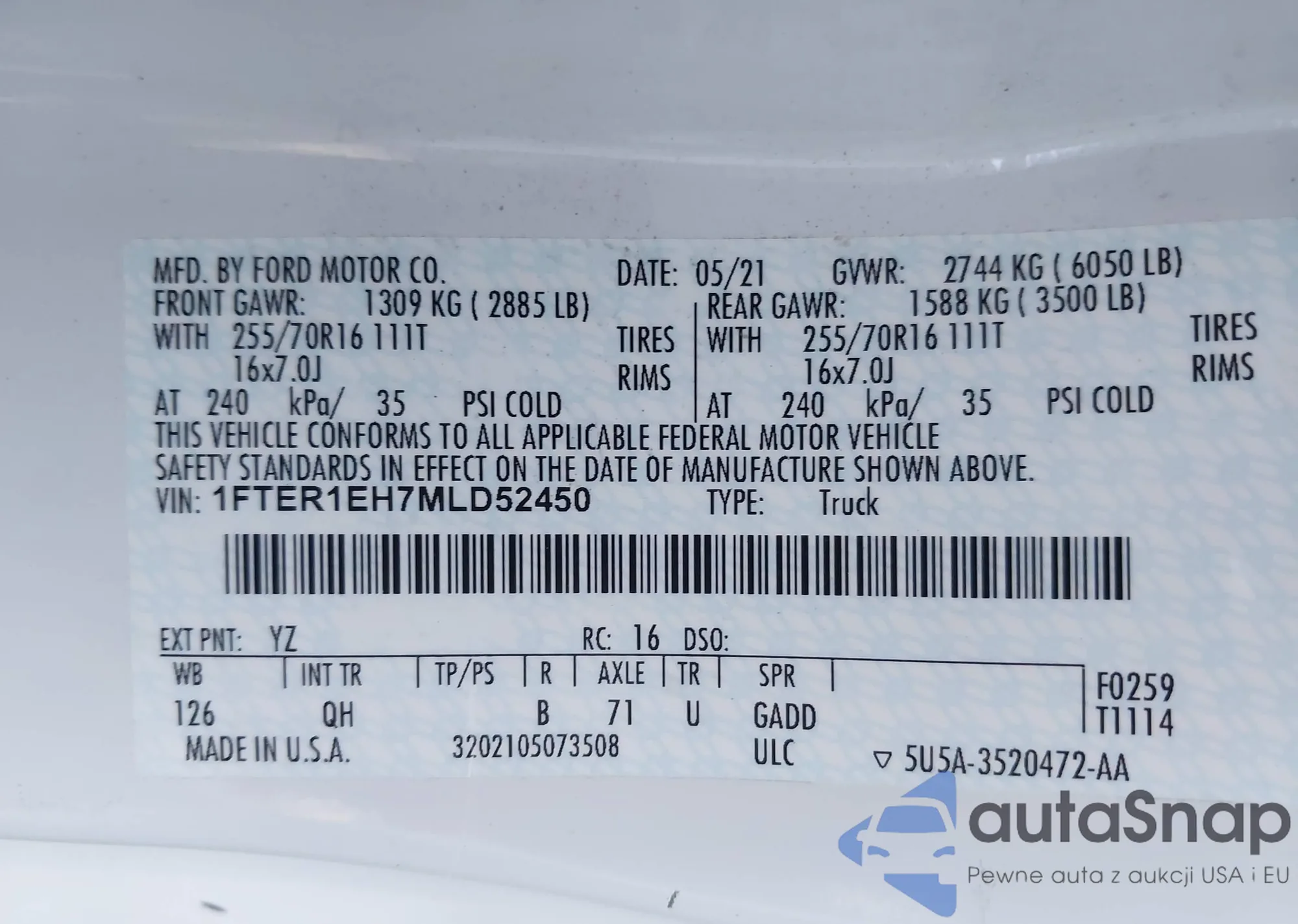 LOT: 42523983 VIN: 1FTER1EH7MLD52450