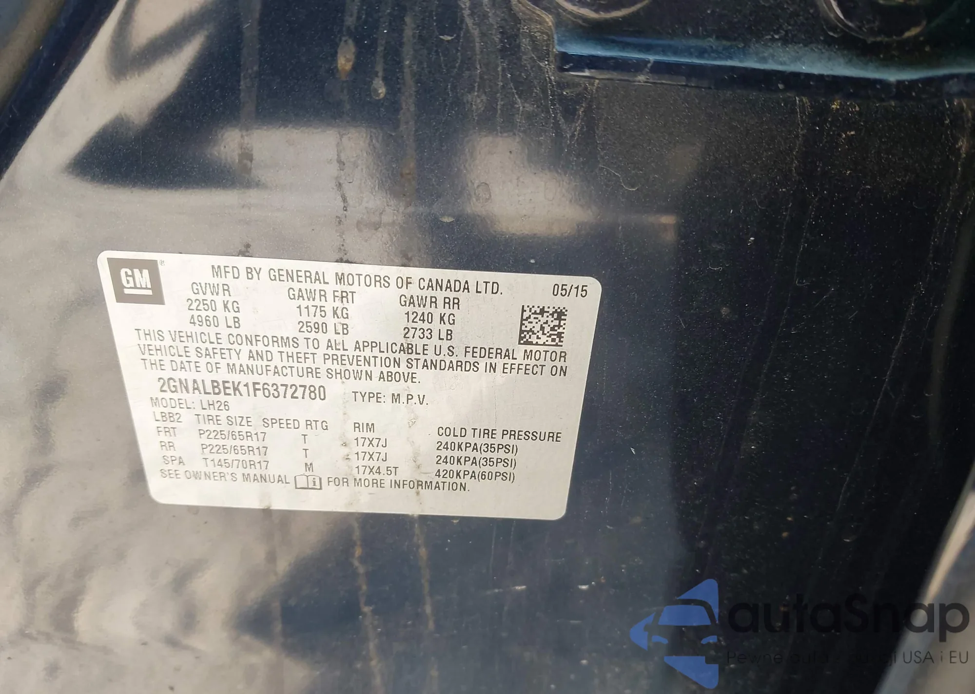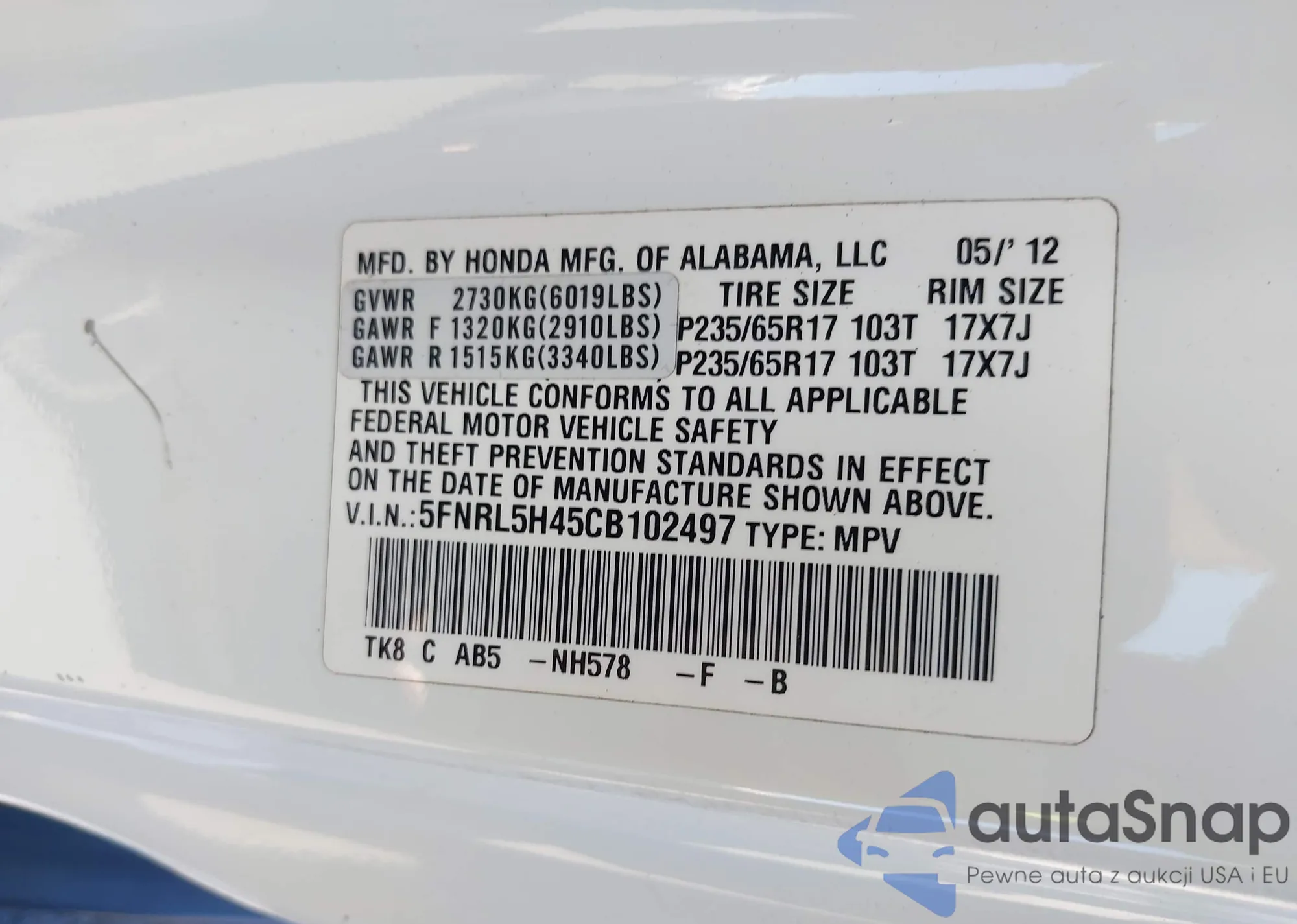 • VIN 5FNRL5H45CB102497