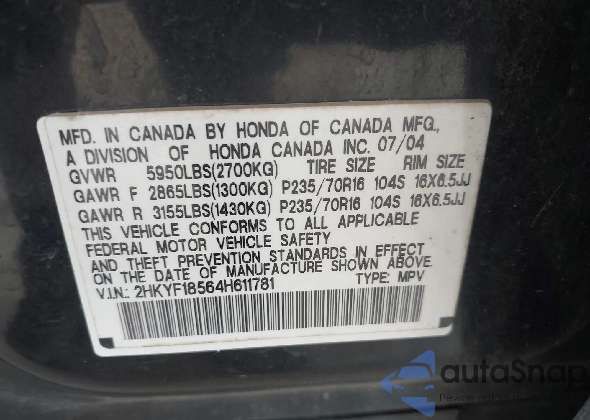 • VIN 2HKYF18564H611781
