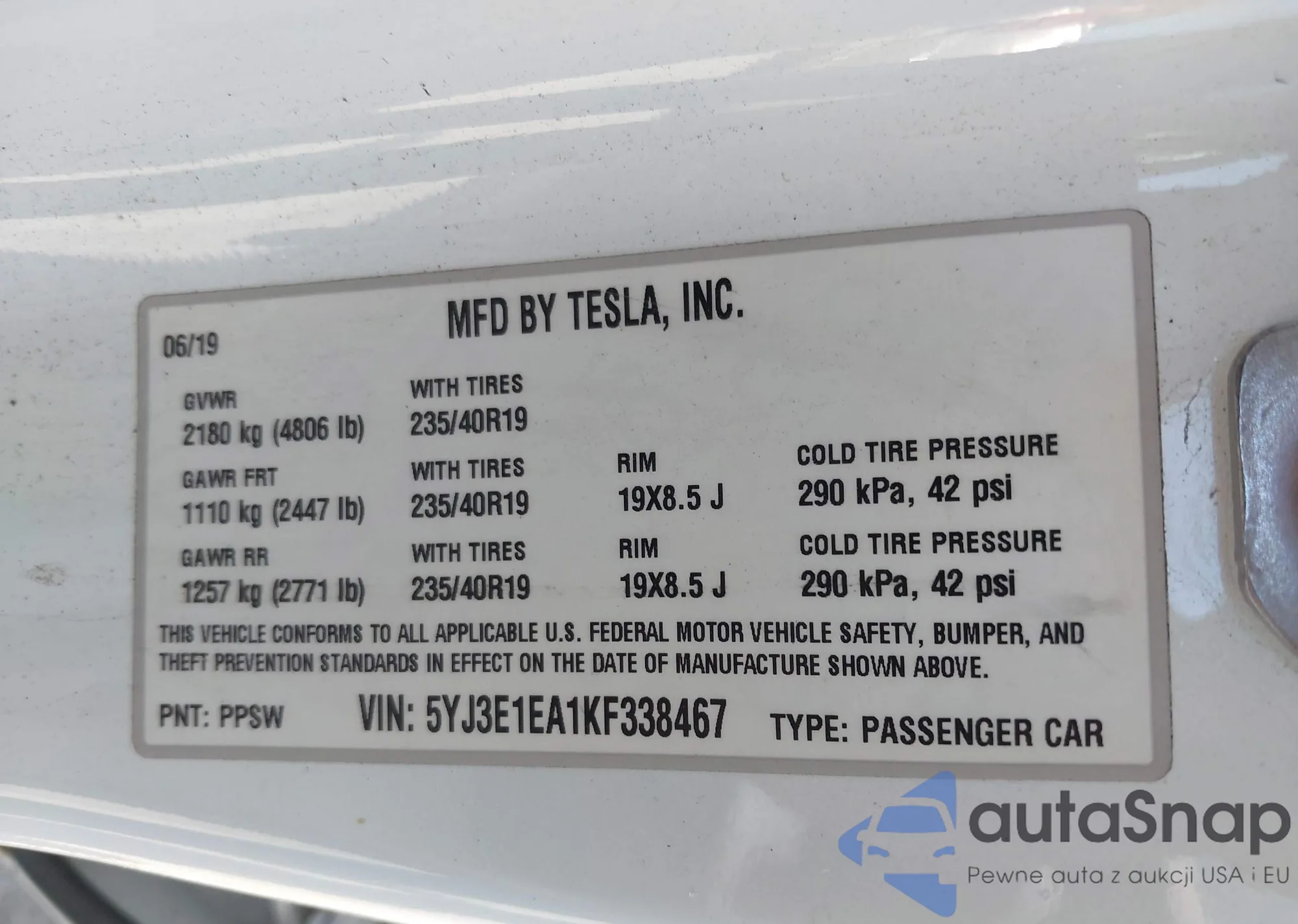 • VIN 5YJ3E1EA1KF338467