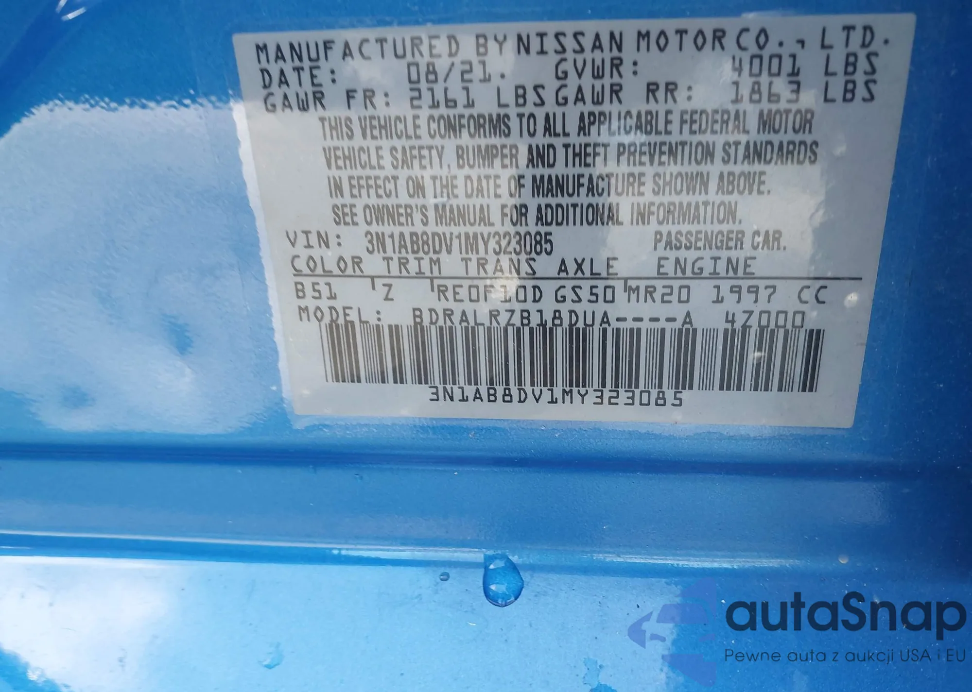 • VIN 3N1AB8DV1MY323085