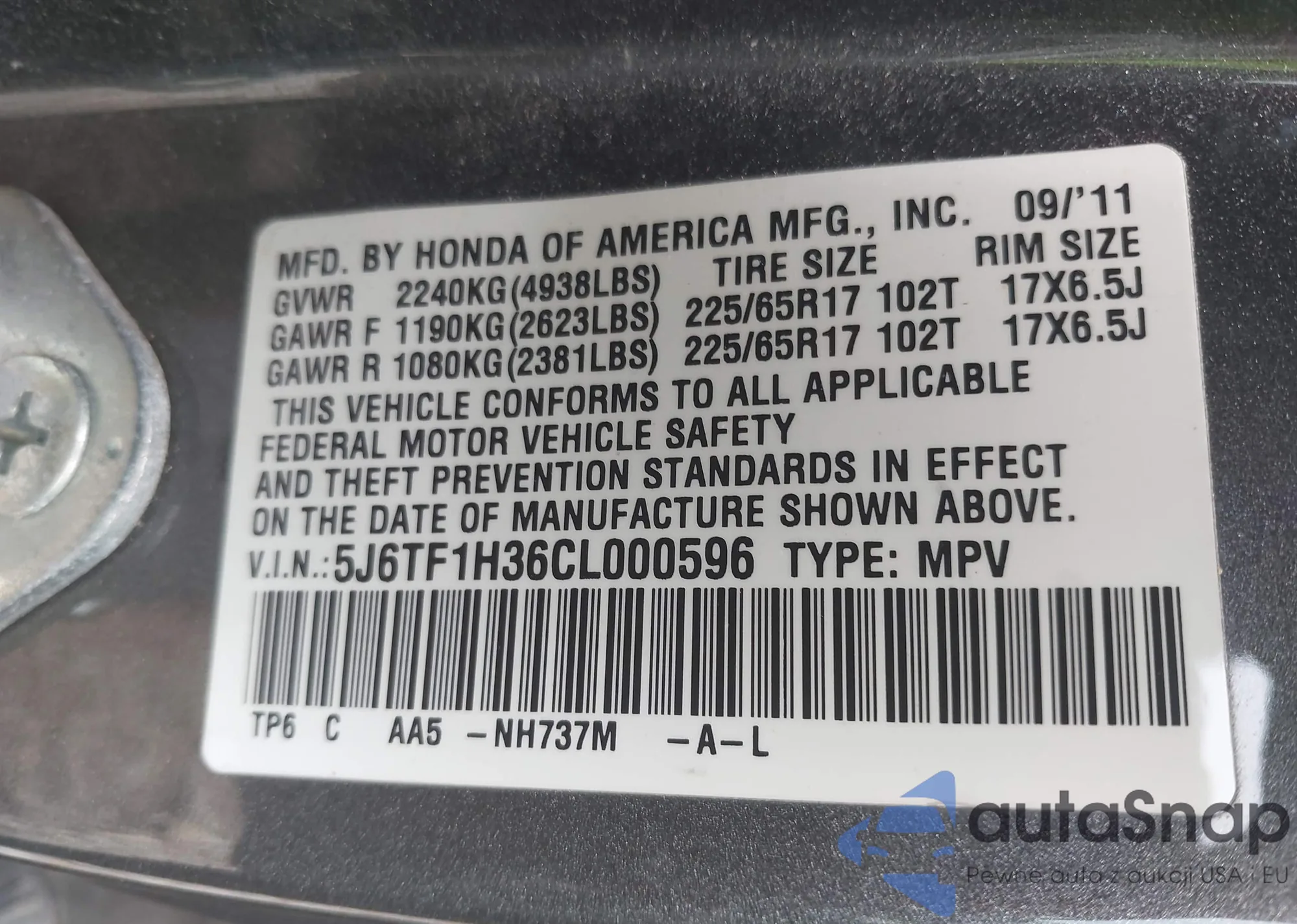 • VIN 5J6TF1H36CL000596
