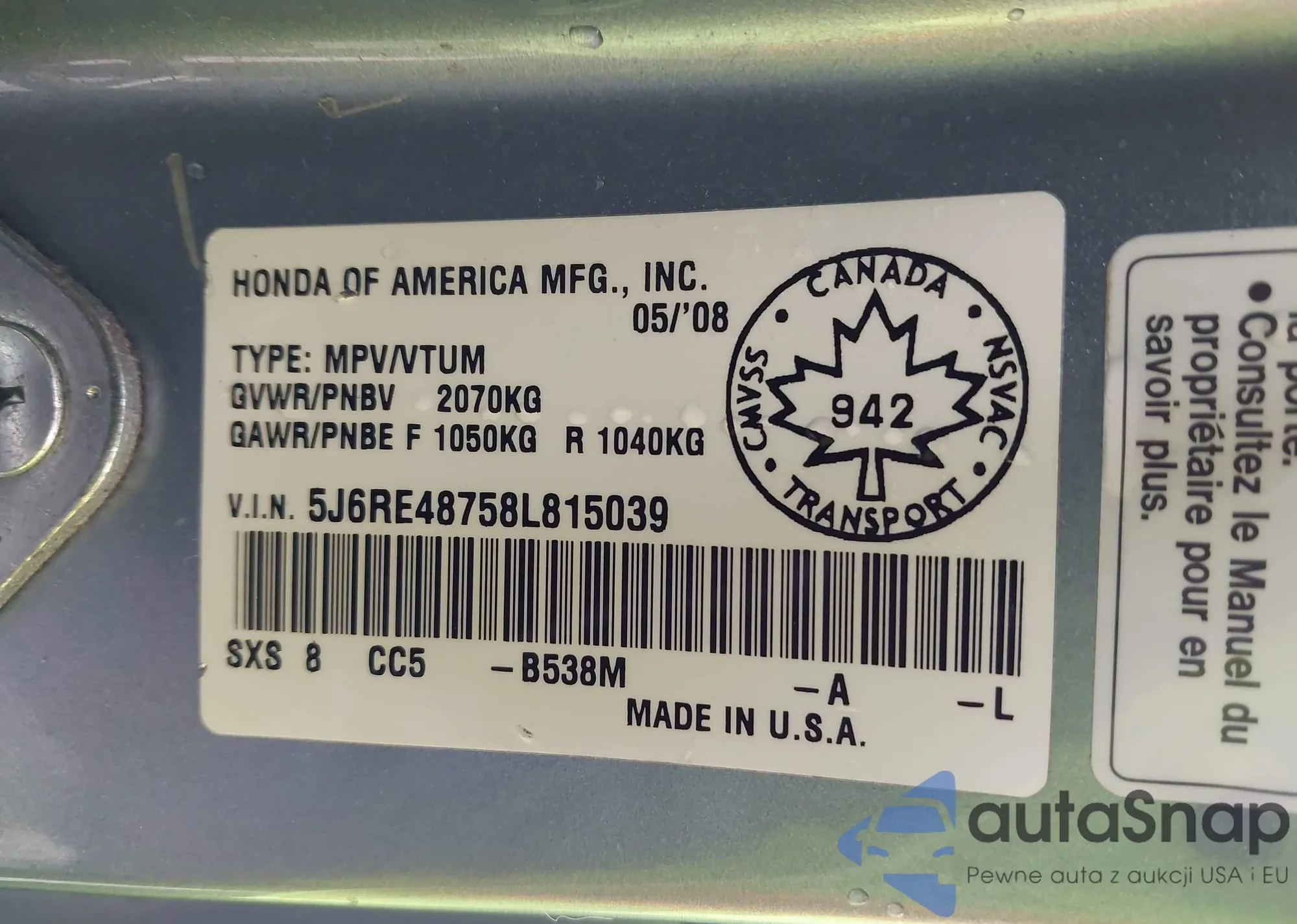 • VIN 2HKRM4H5XGH693871