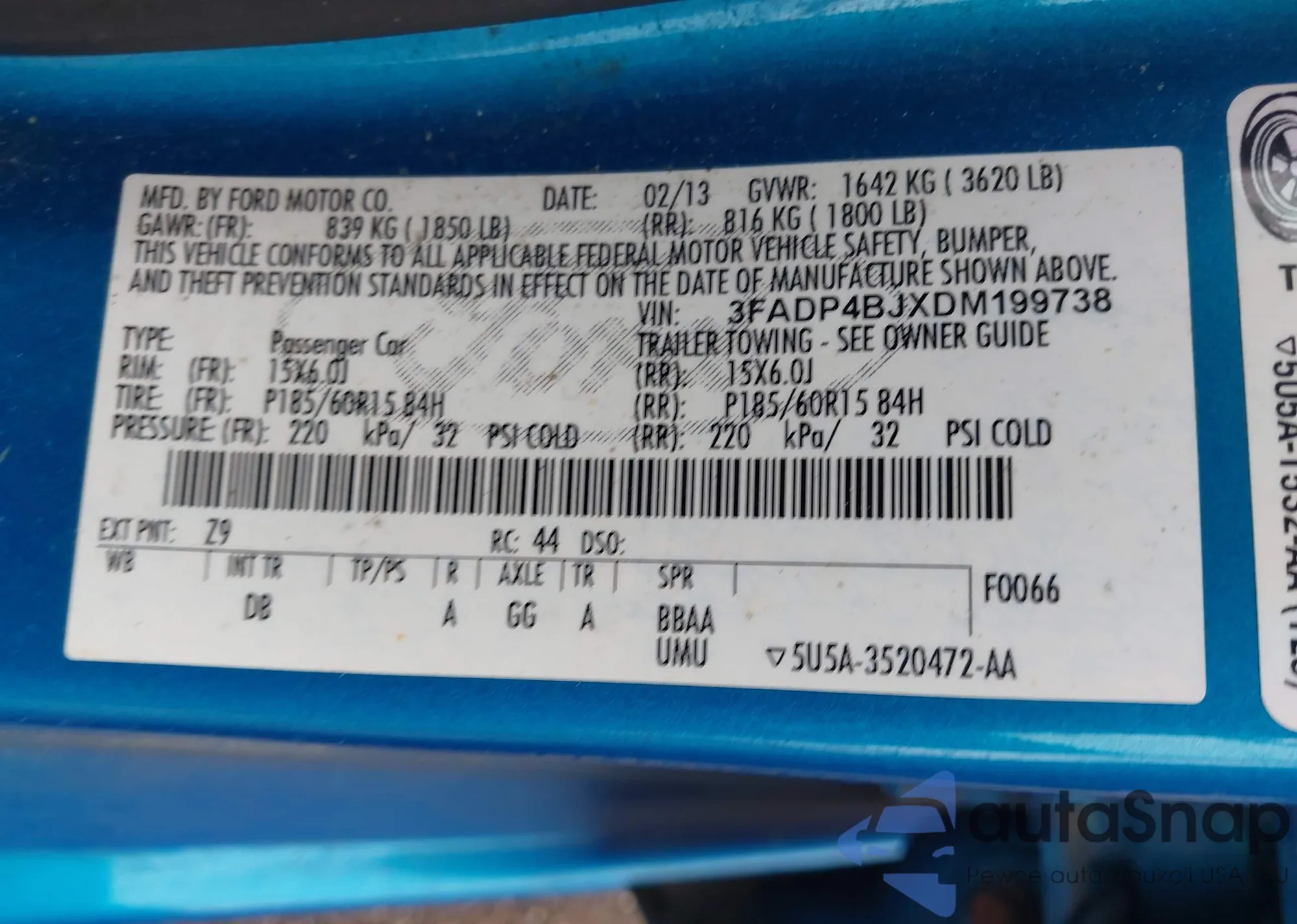 • VIN 3FADP4BJXDM199738