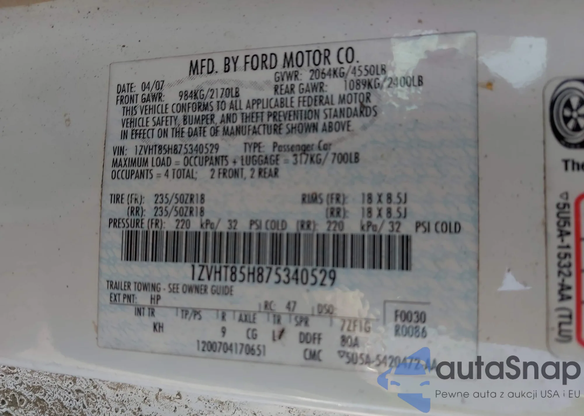 • VIN 1ZVHT85H875340529