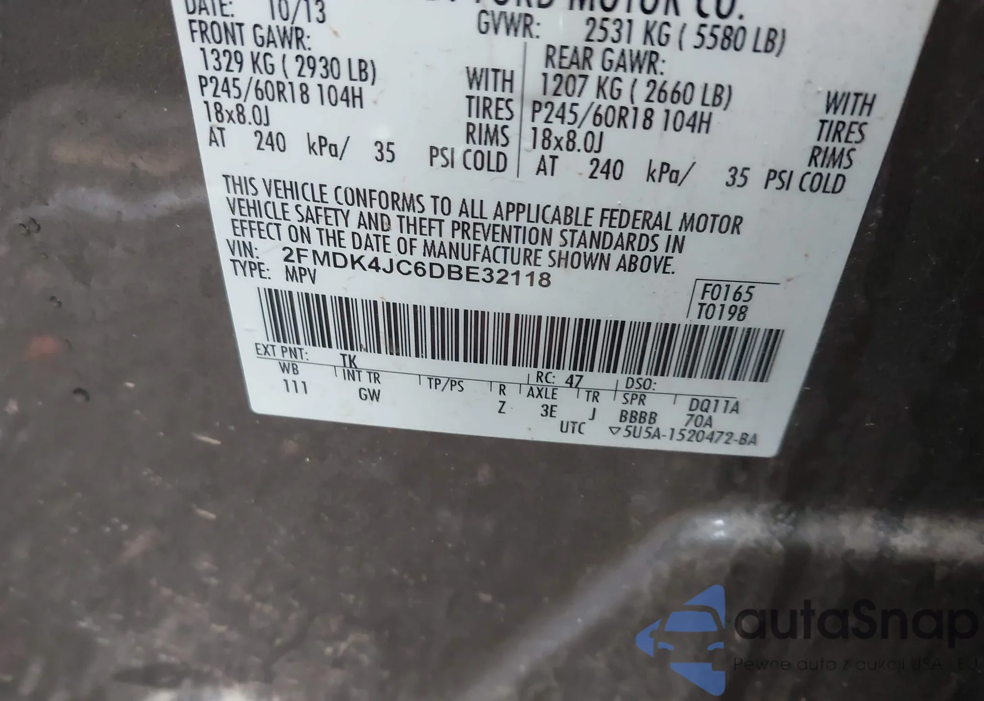 LOT: 42493069 VIN: 2FMDK4JC6DBE32118