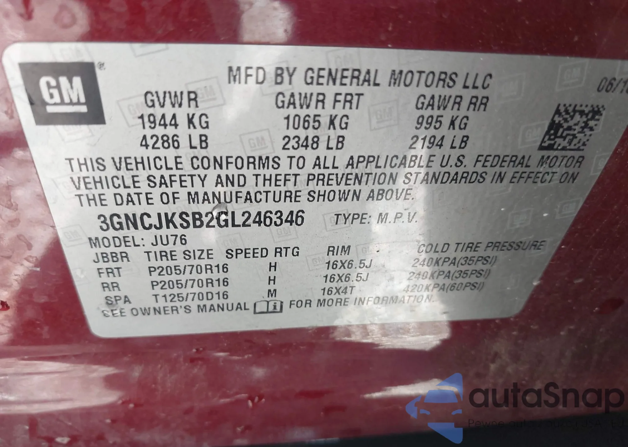 LOT: 42493230 VIN: 3GNCJKSB2GL246346