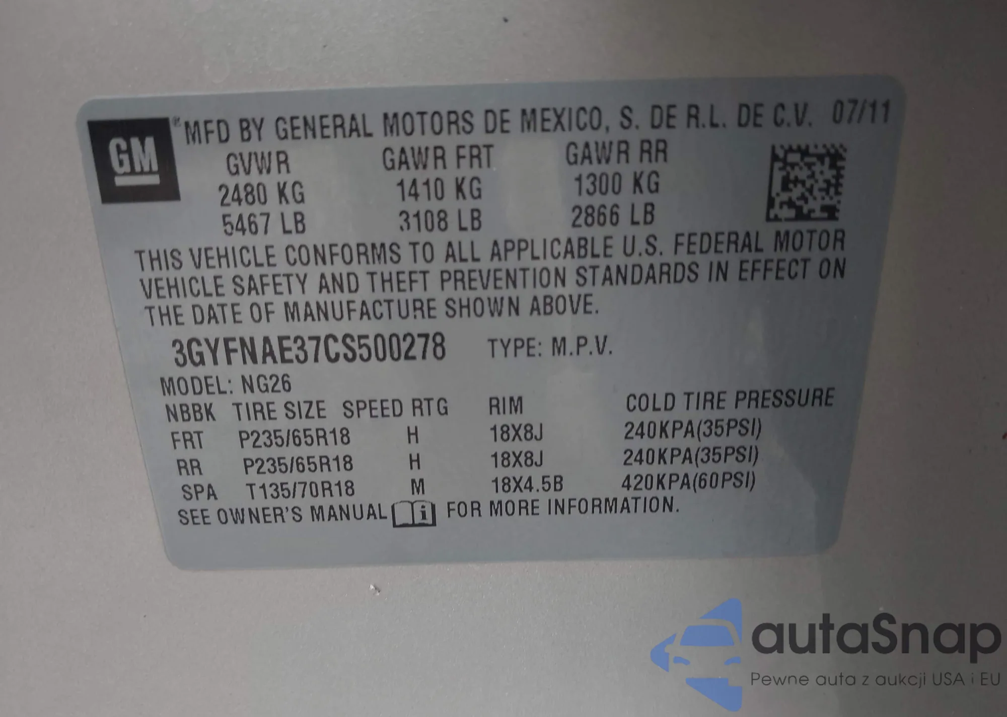 • VIN 3GYFNAE37CS500278