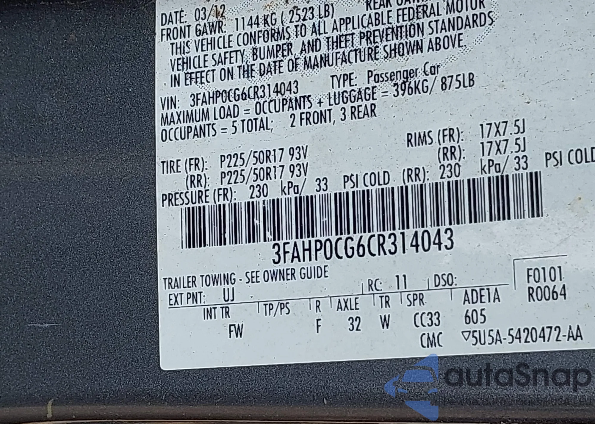 • VIN 3FADP4EJXCM114150