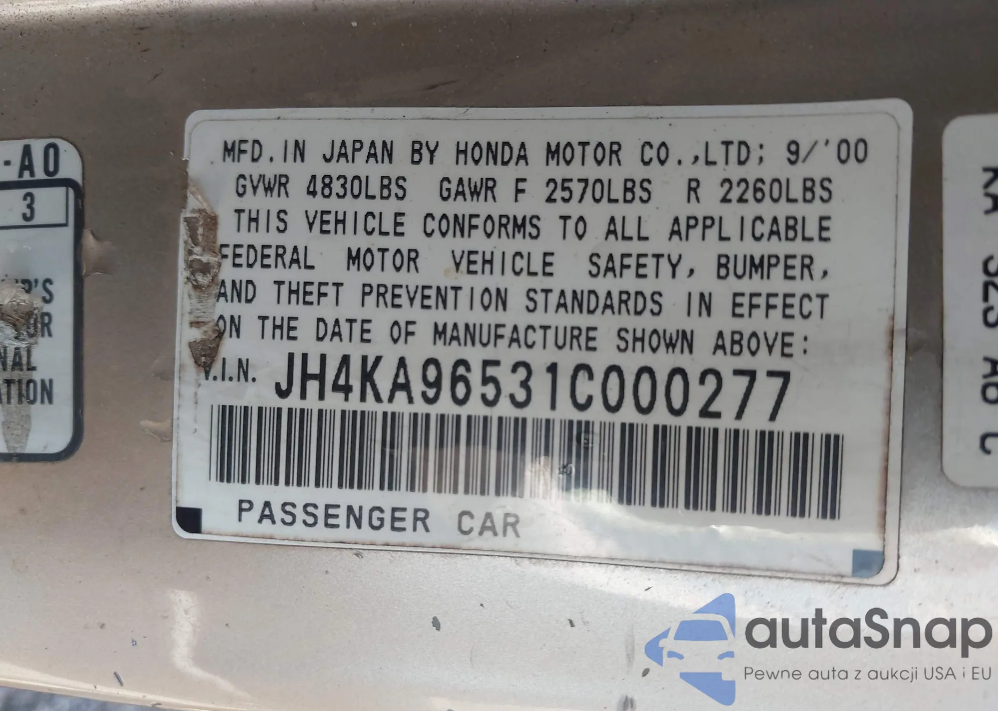 LOT: 42569539 VIN: JH4KA96531C000277