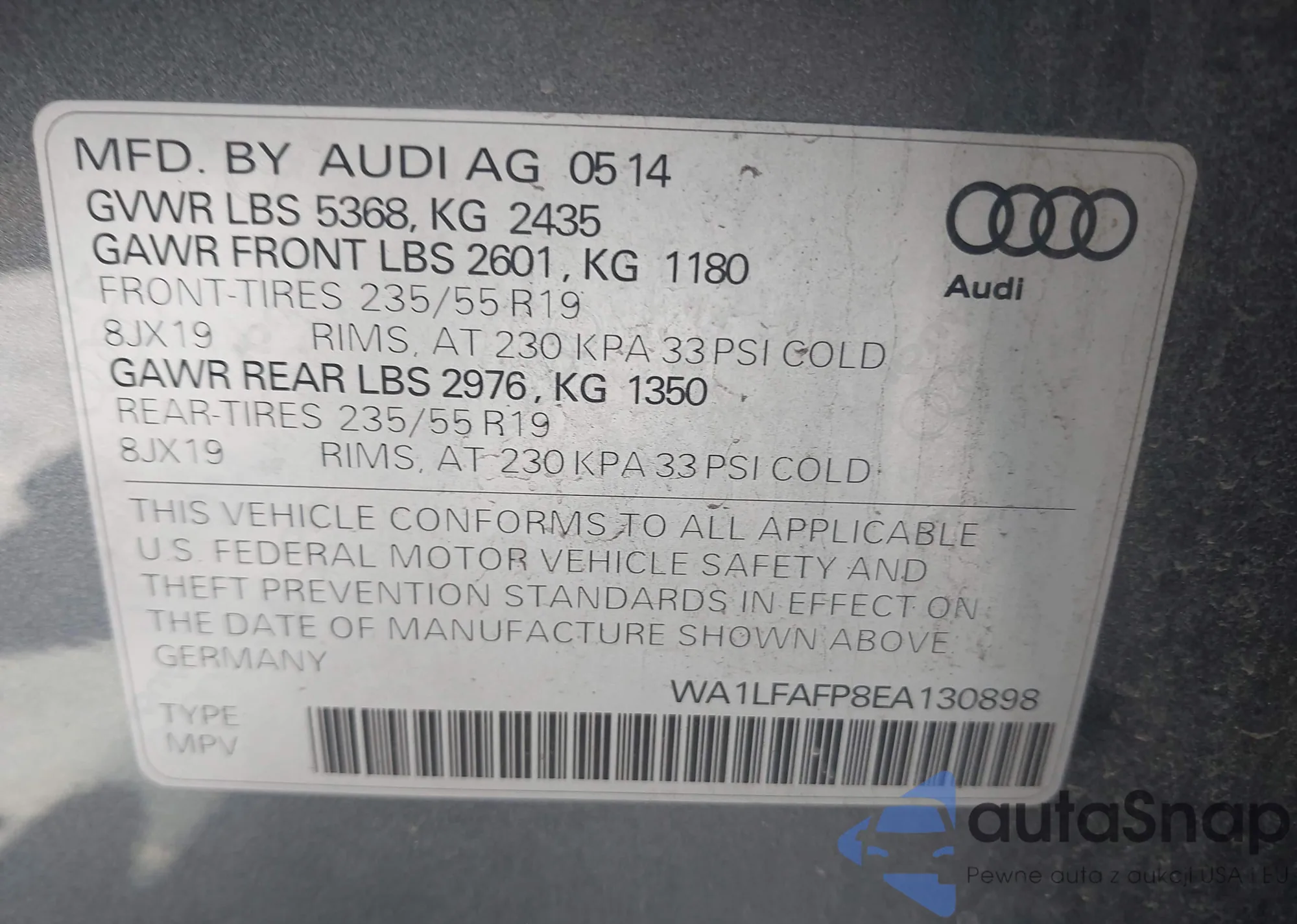 LOT: 42737461 VIN: WA1LFAFP8EA130898