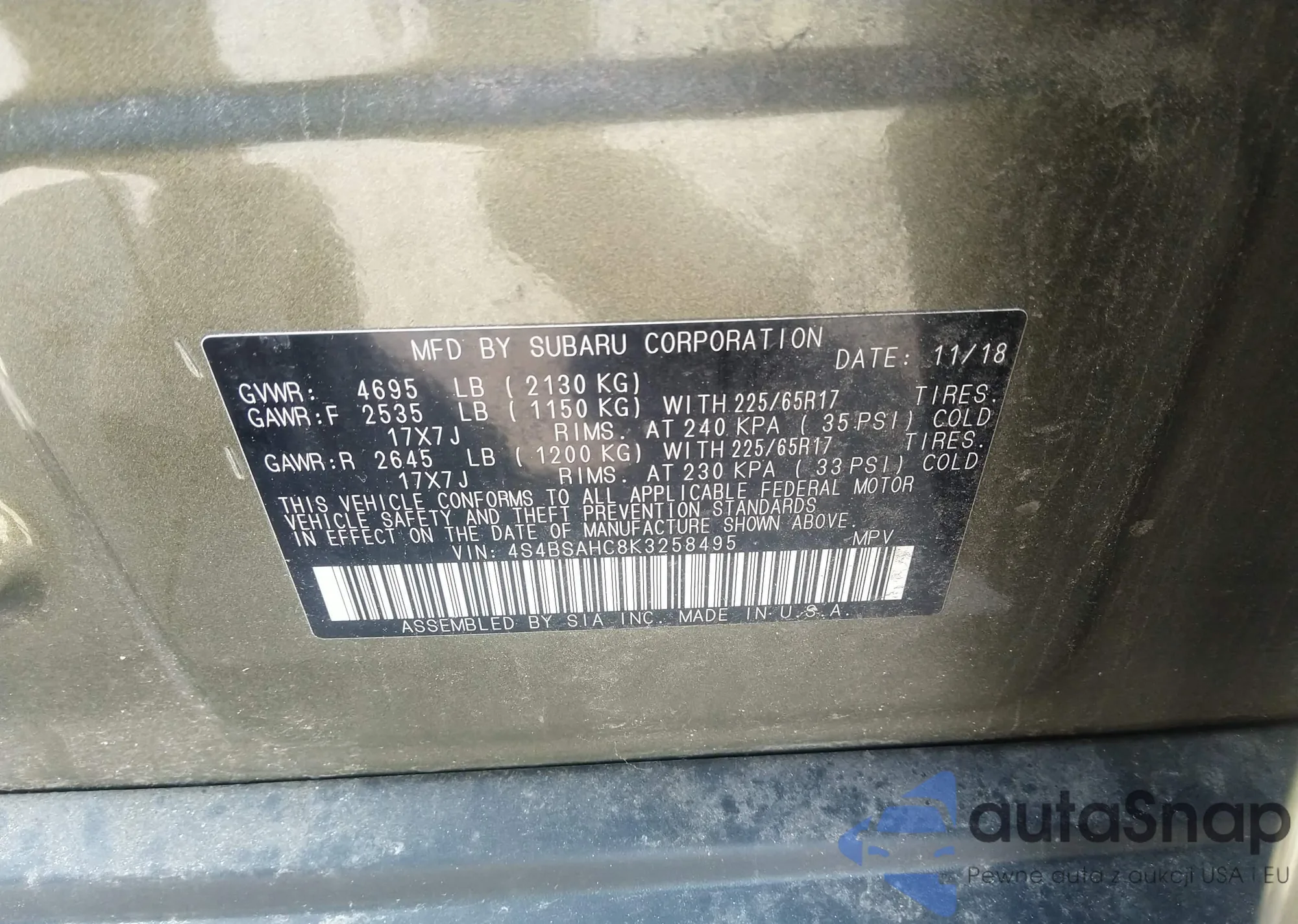 • VIN 4S4BSAHC8K3258495