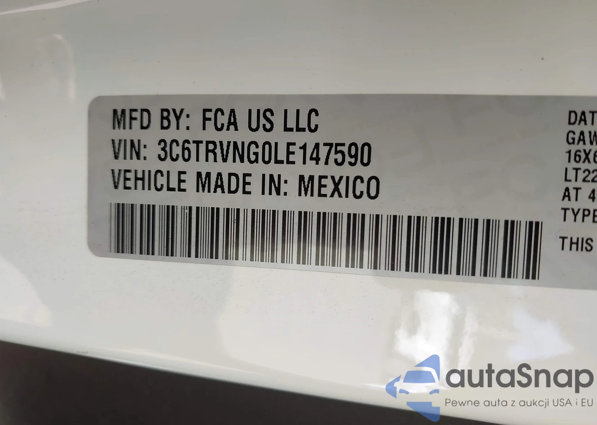 LOT: 42411129 VIN: 3C6TRVNG0LE147590