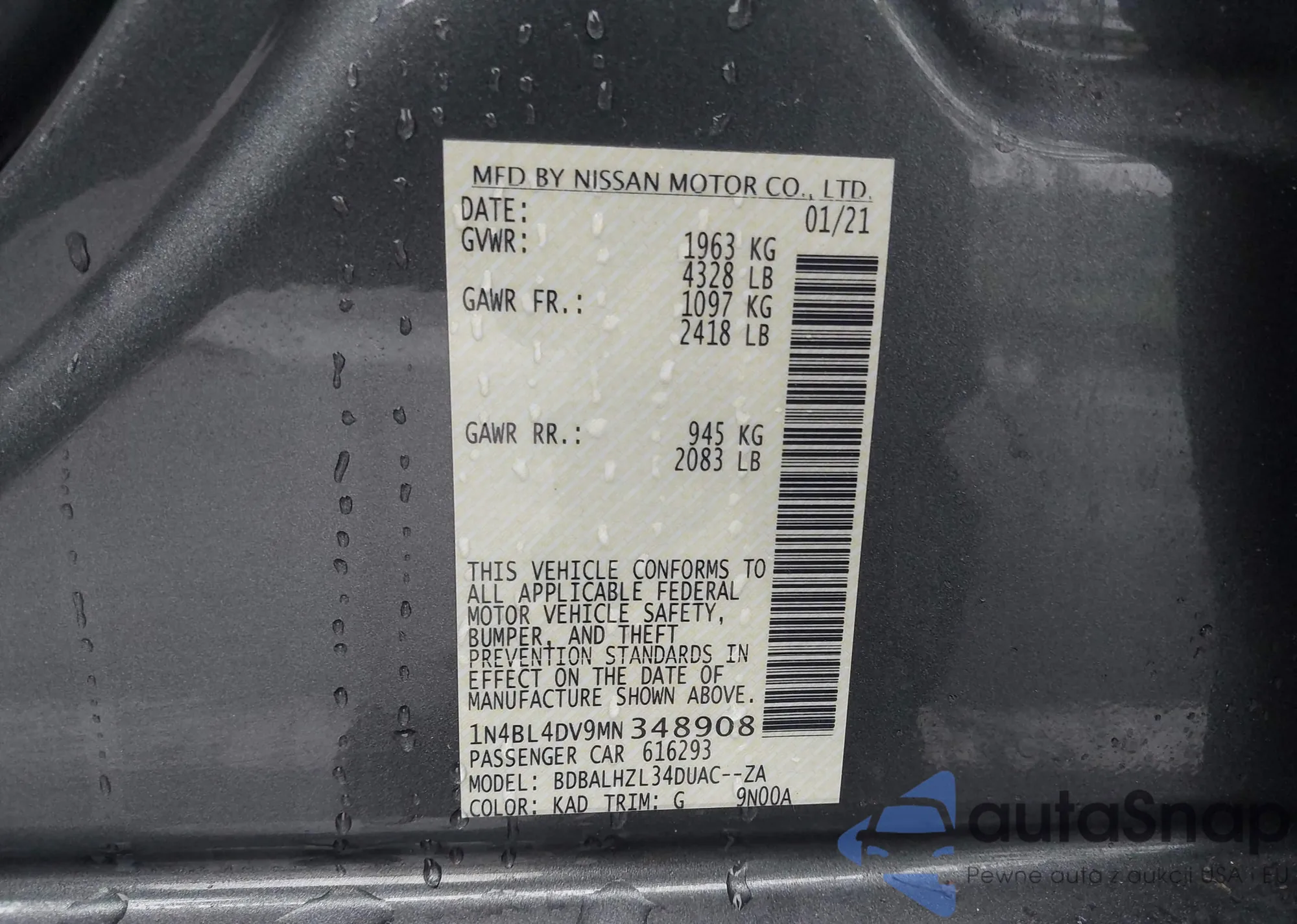 LOT: 42265458 VIN: 1N4BL4DV9MN348908