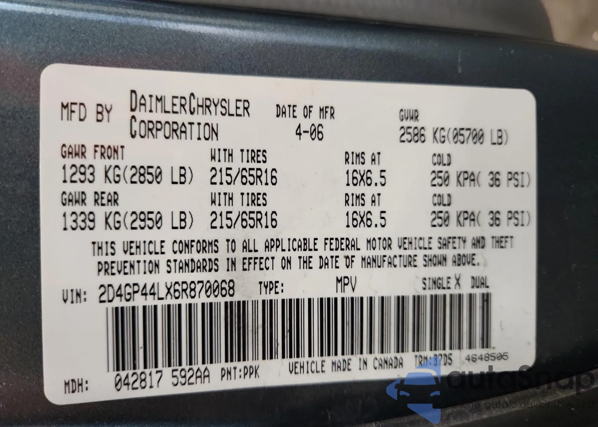 • VIN 2D4GP44LX6R870068