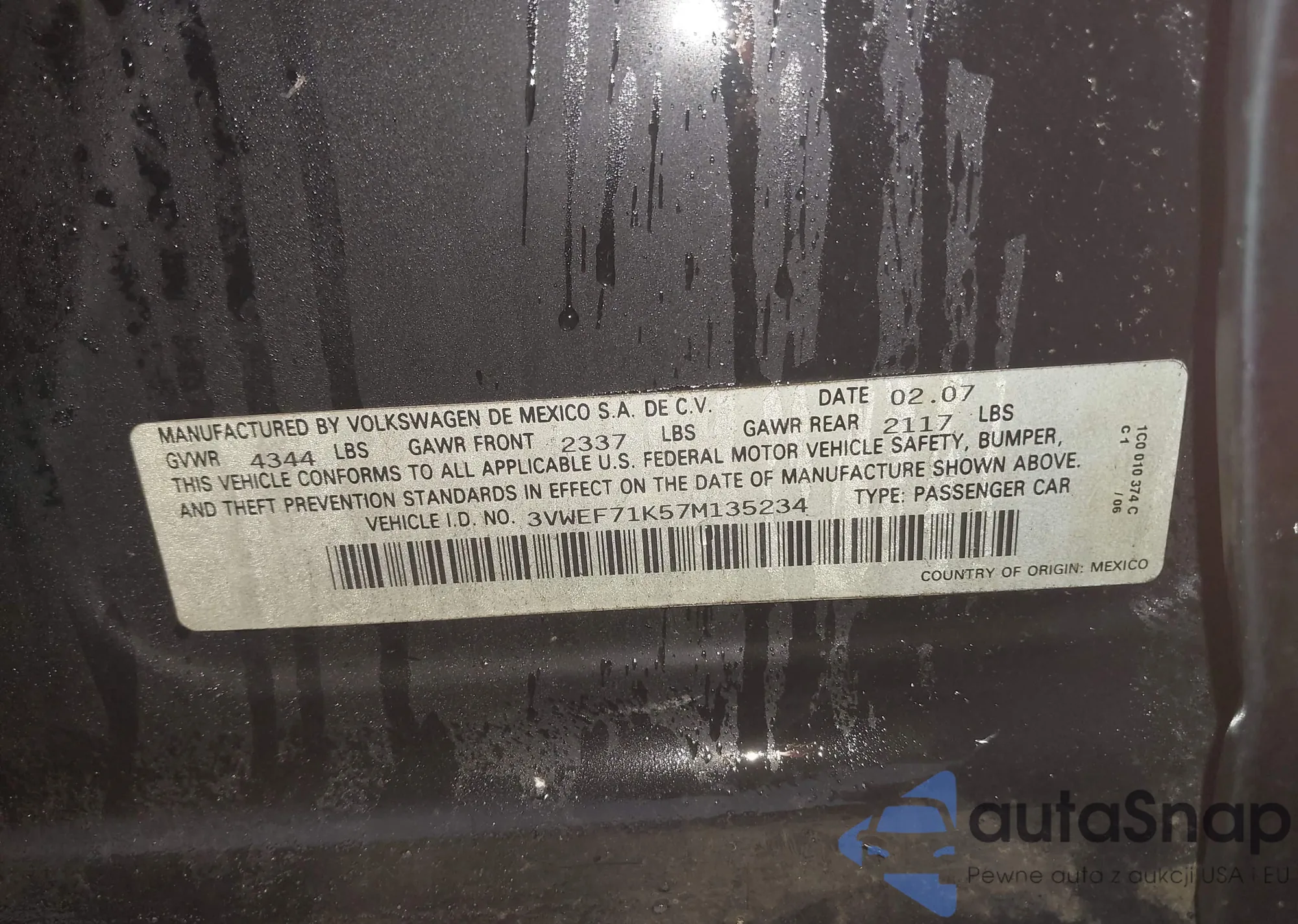 LOT: 39485108 VIN: 3VWEF71K57M135234