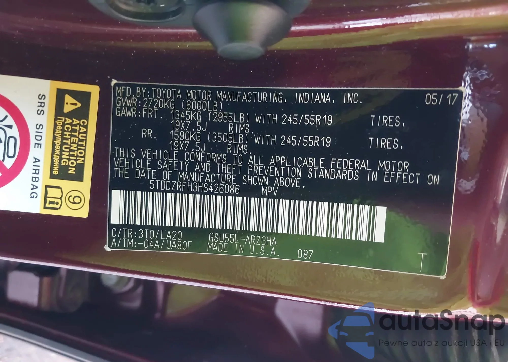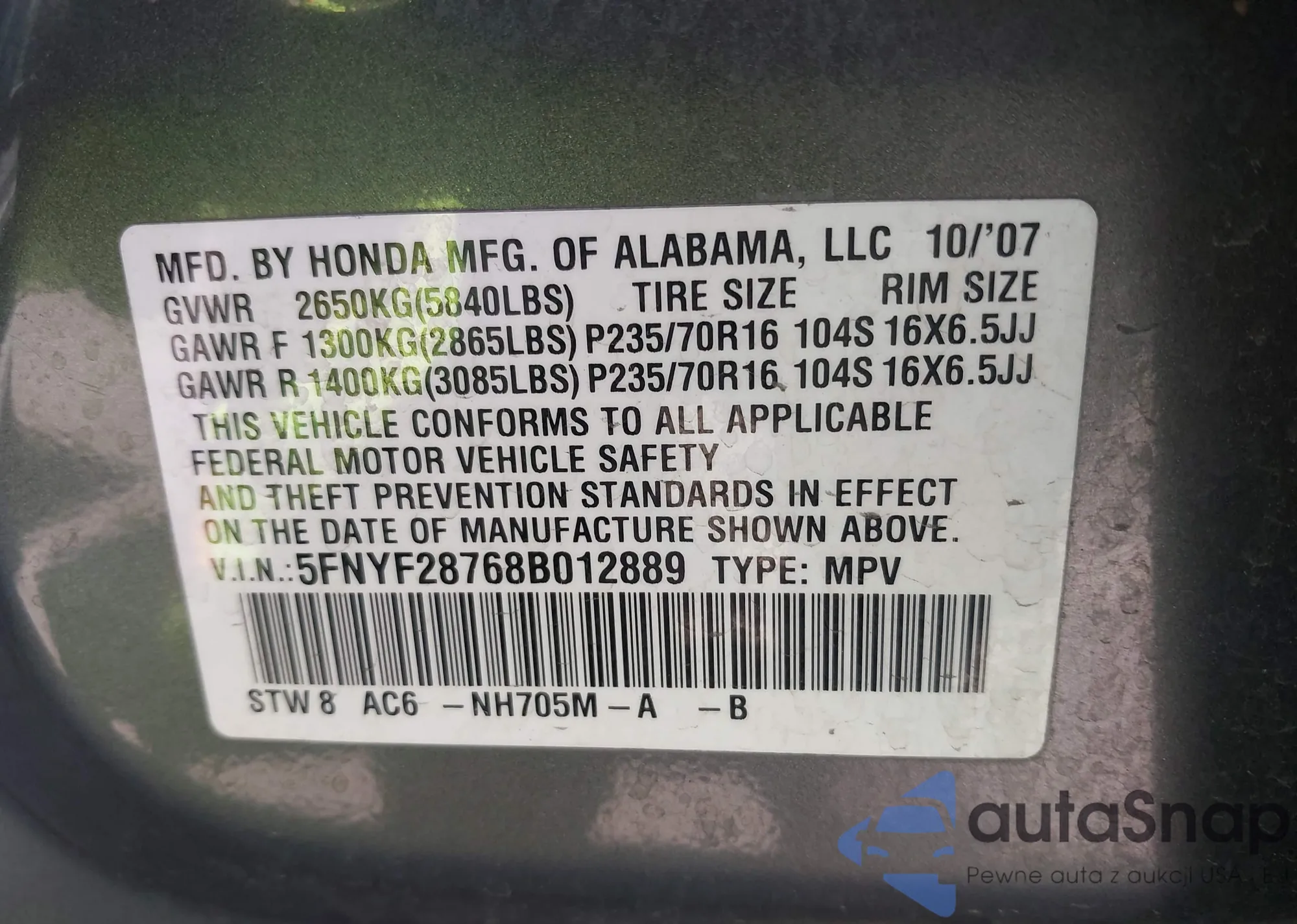 • VIN 5J6RE48517L000320