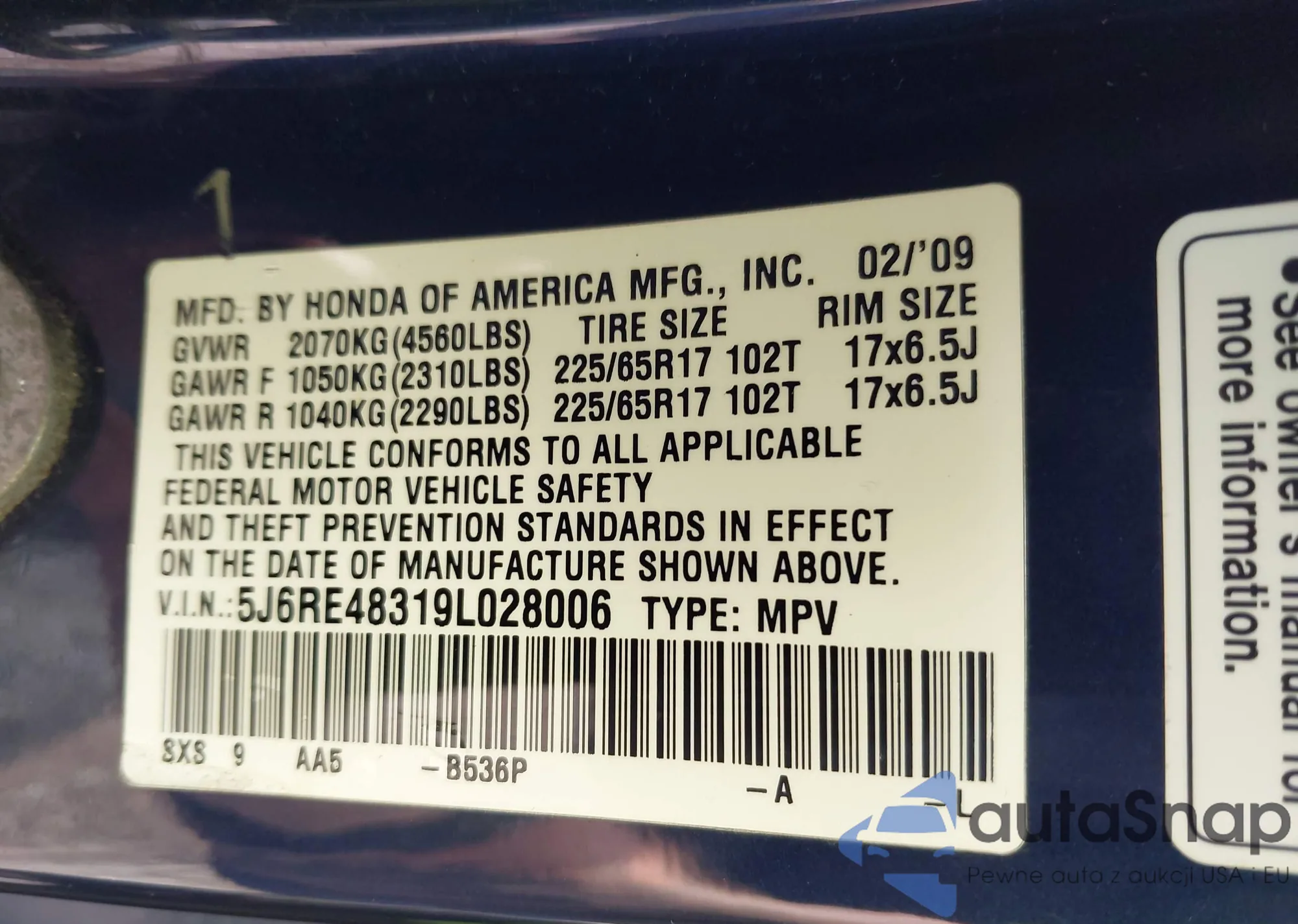 • VIN 5J6RE48319L028006