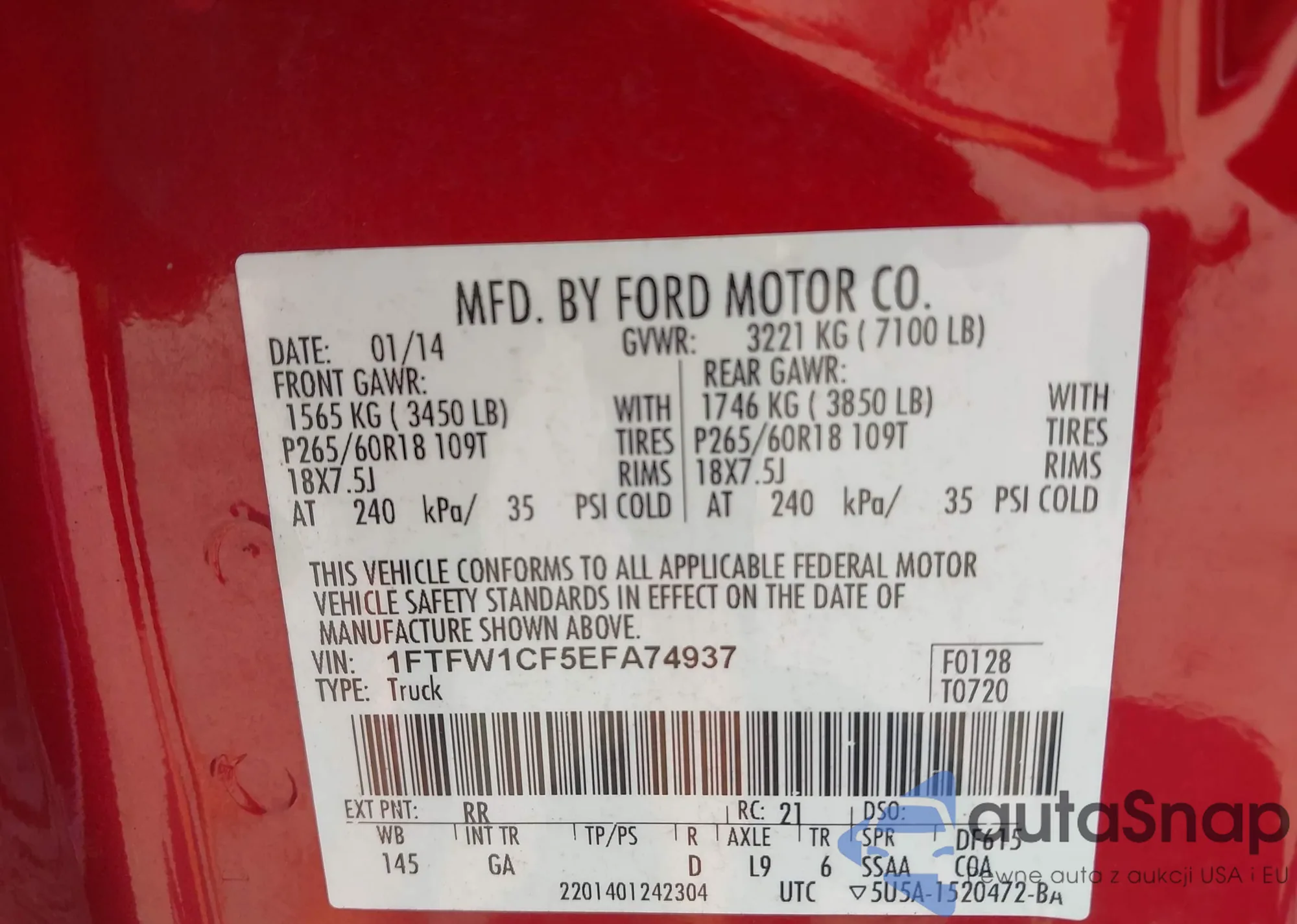 • VIN 1FTFW1CF5EFA74937
