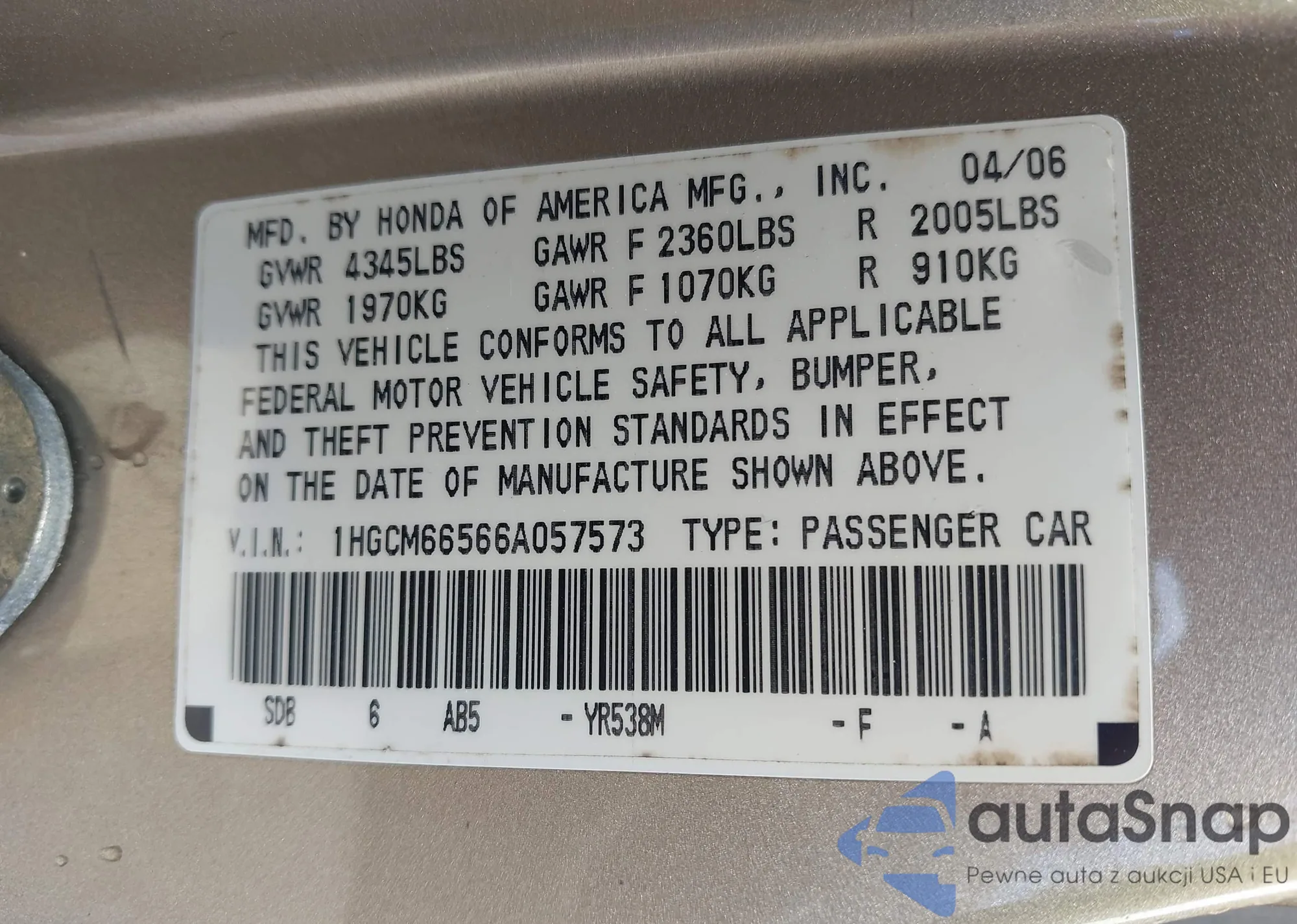 LOT: 42639192 VIN: 1HGCM66566A057573