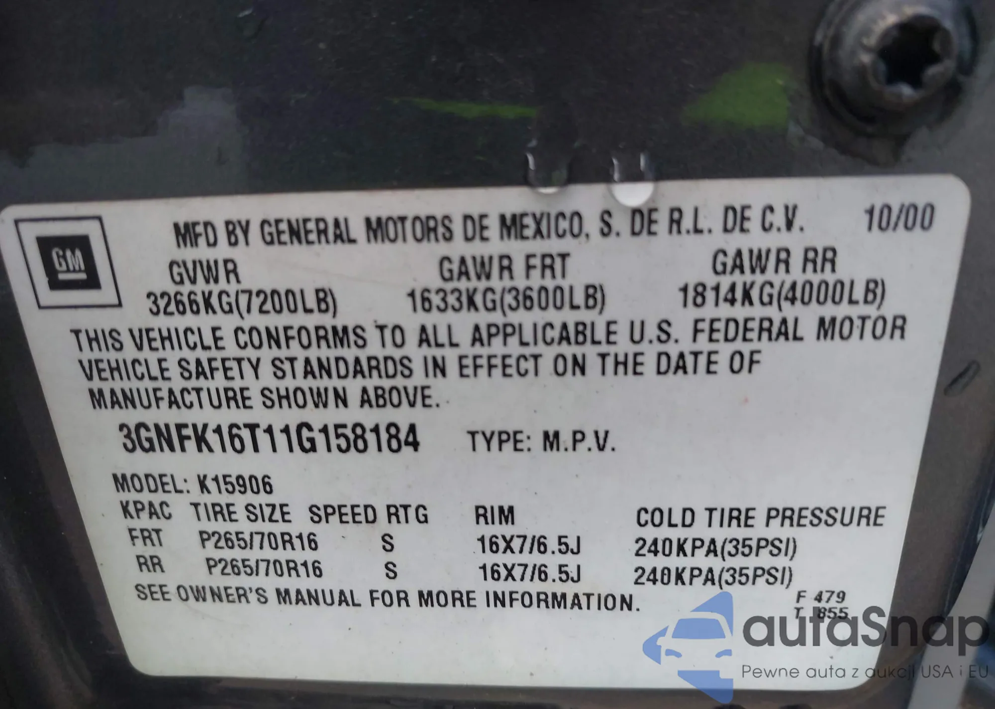 LOT: 42738986 VIN: 3GNFK16T11G158184