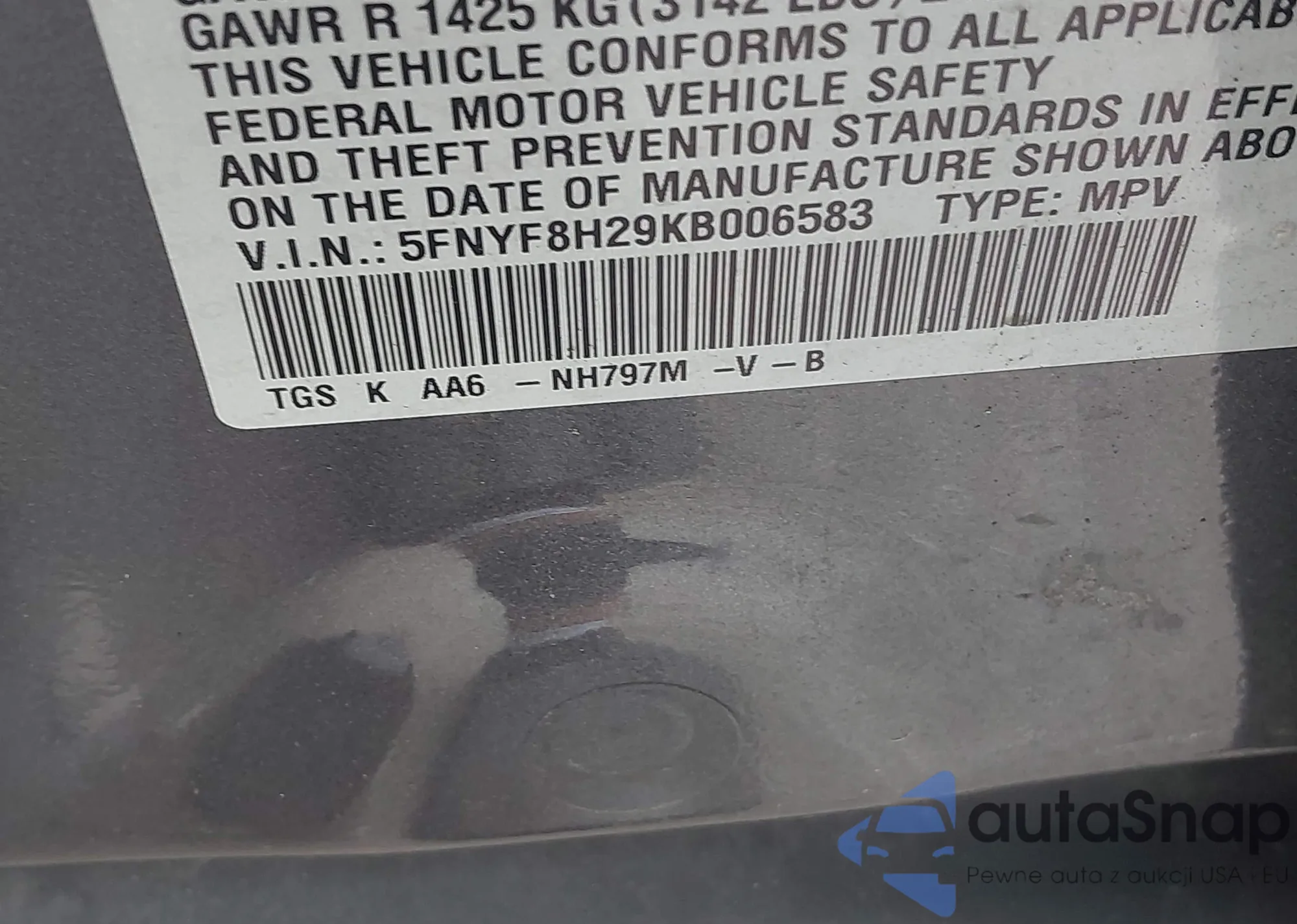 • VIN 5FNYF8H29KB006583