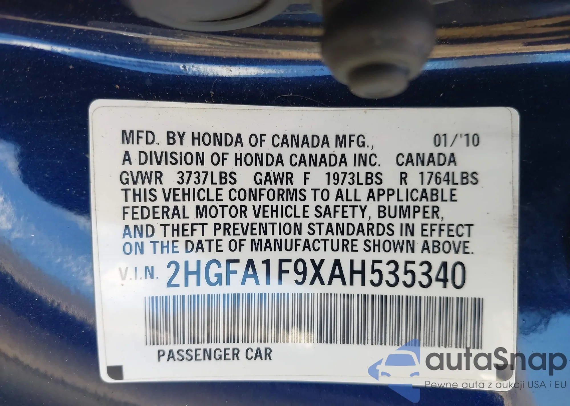 • VIN 2HGFA1F9XAH535340
