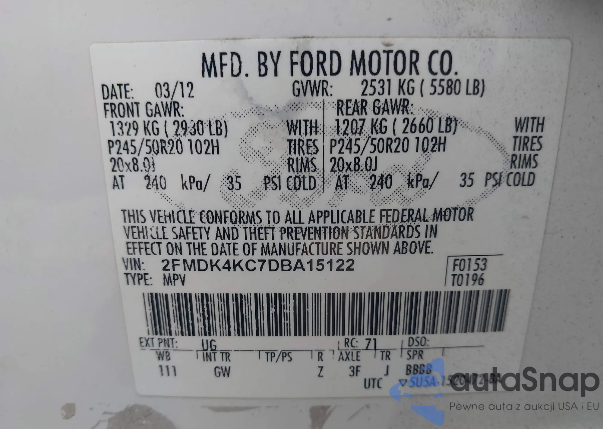 LOT: 41916369 VIN: 2FMDK4KC7DBA15122